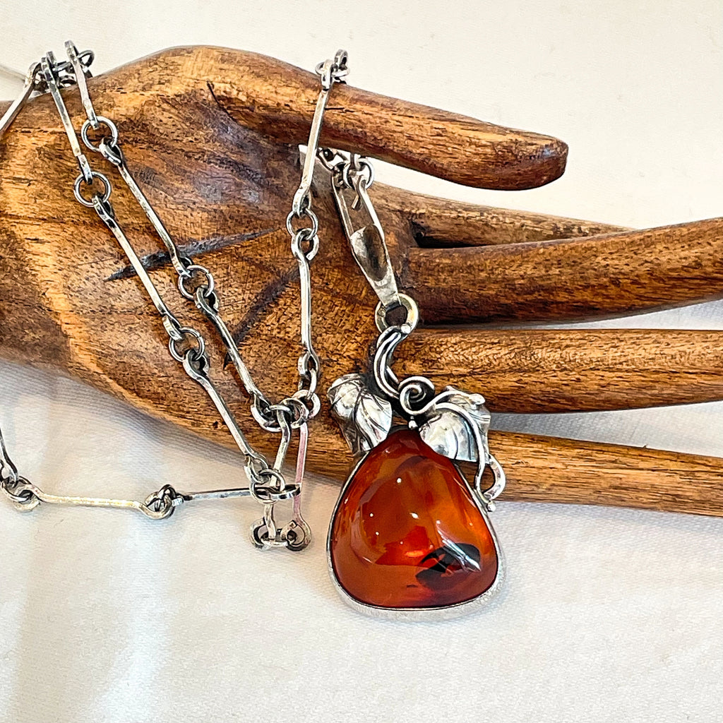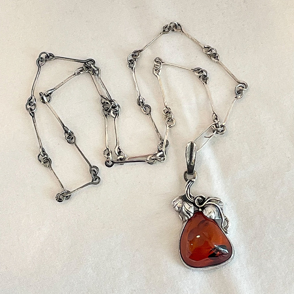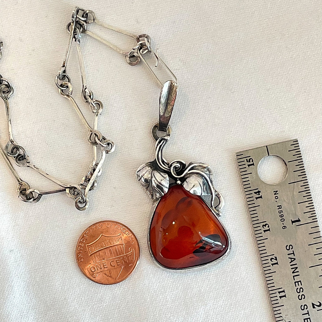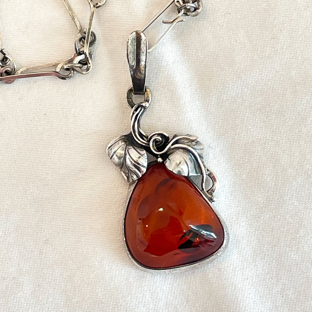 Vintage Amber Sterling Silver Pendant Necklace, Art Nouveau Style