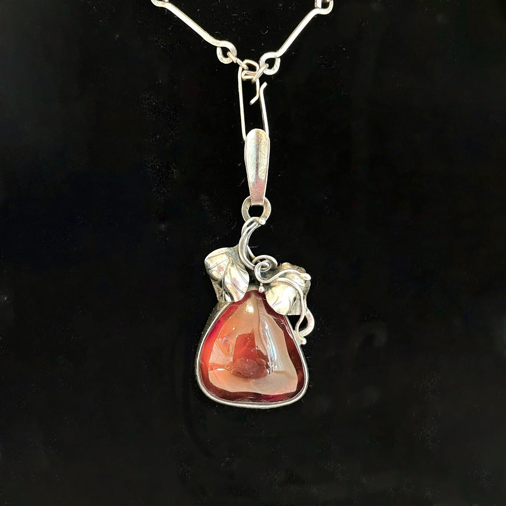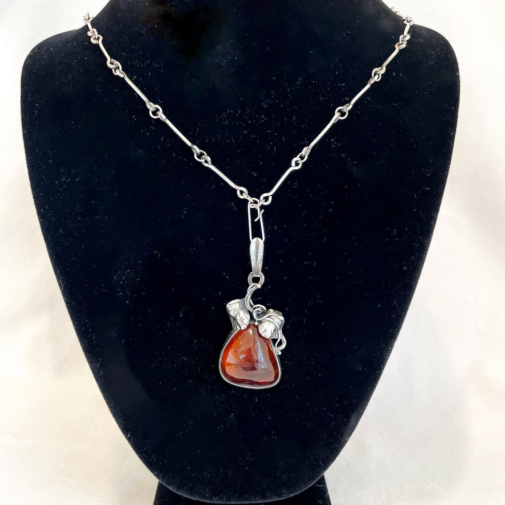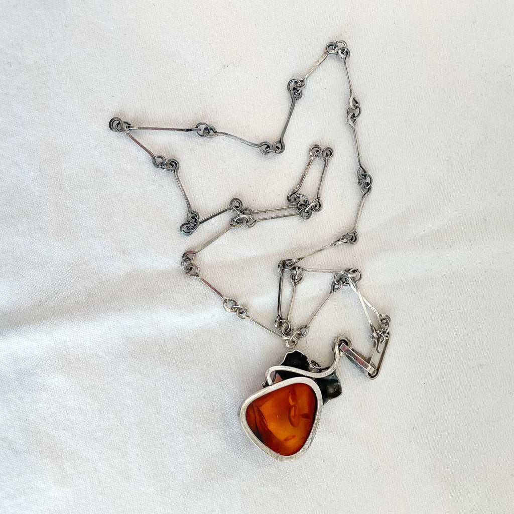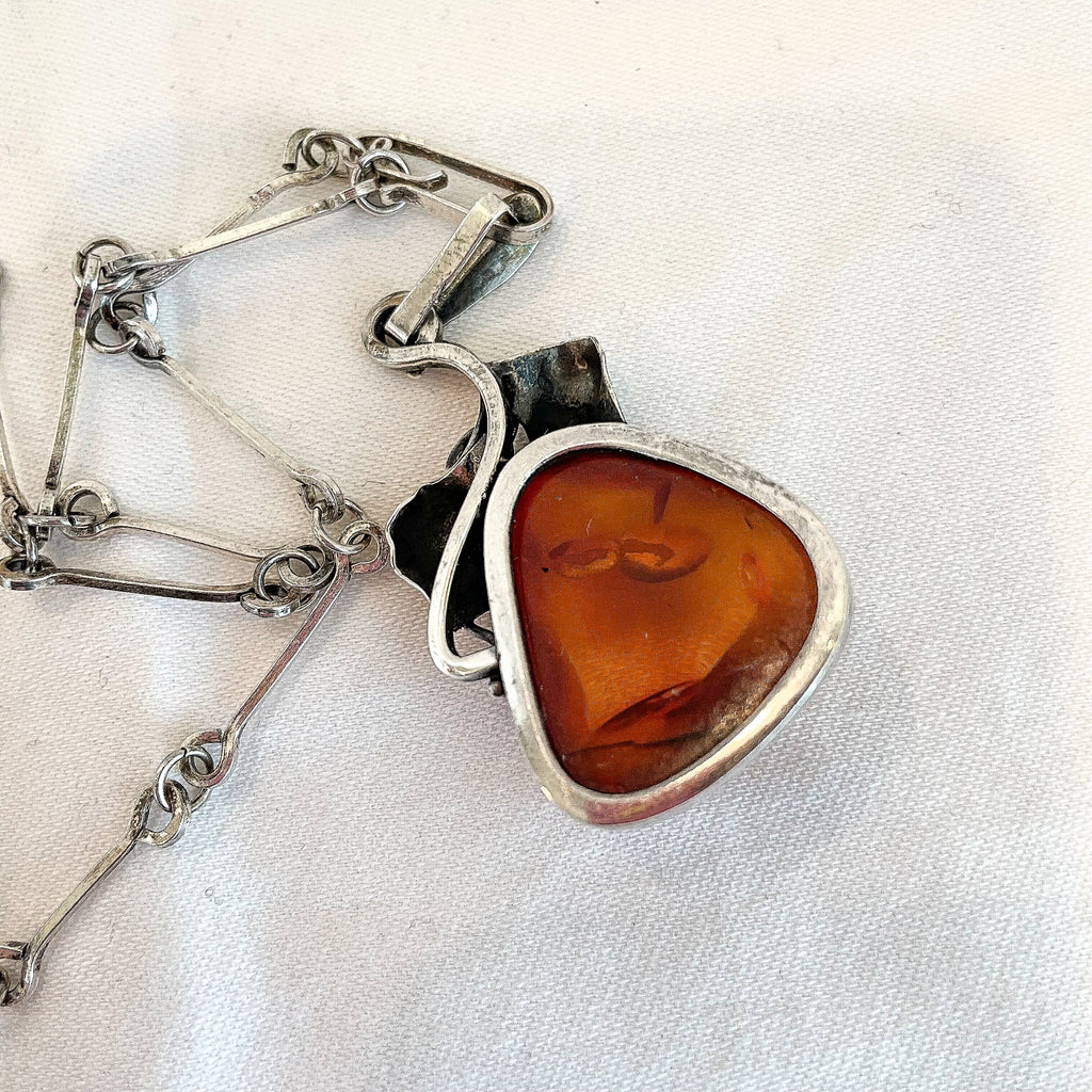 Vintage Amber Sterling Silver Pendant Necklace, Art Nouveau Style