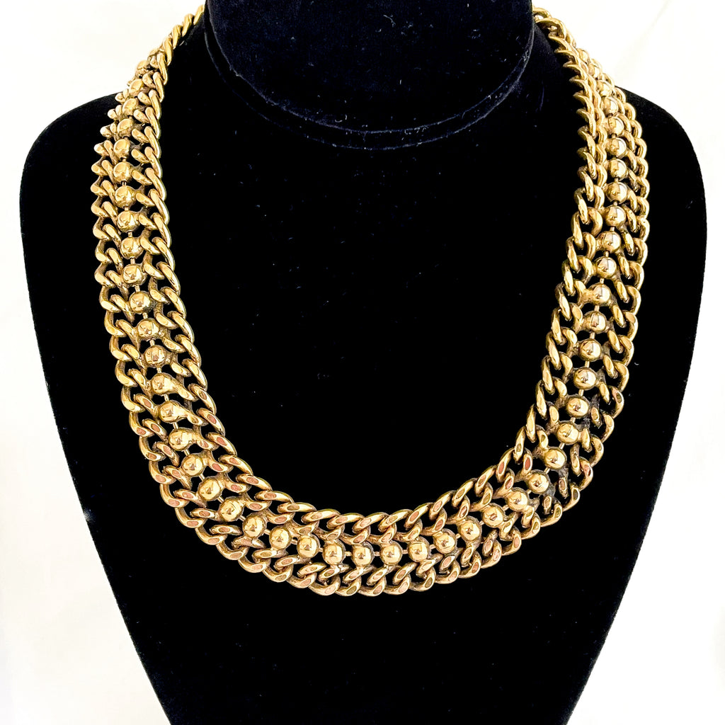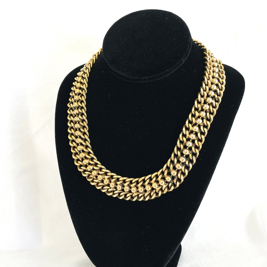 Vintage gold tone double link chain necklace with ball detail in the center.