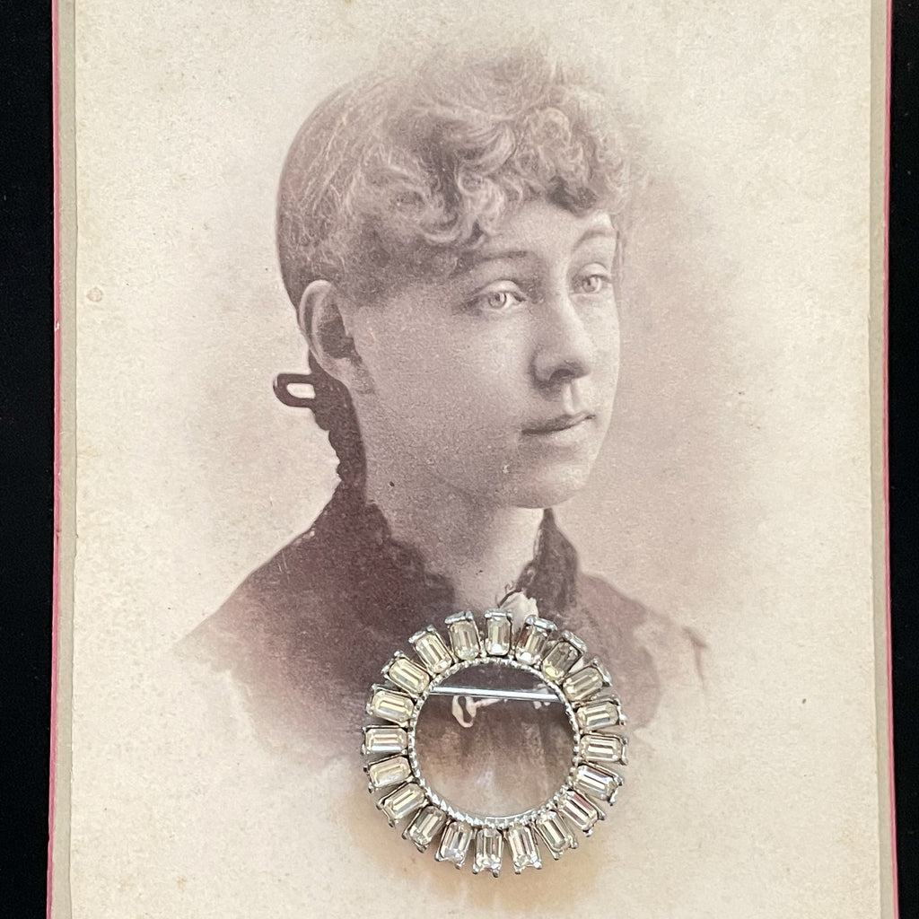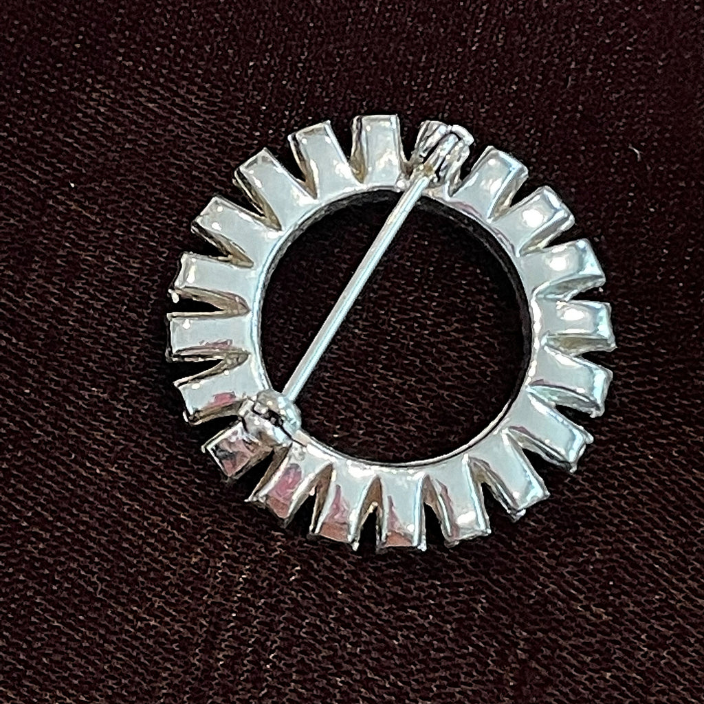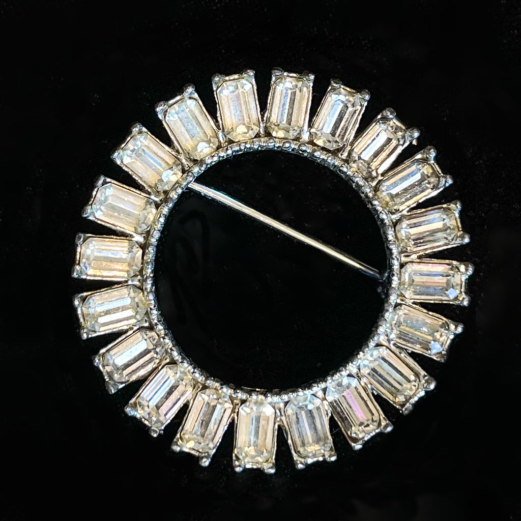 Vintage MCM circular clear rhinestone brooch with baguette stones,