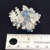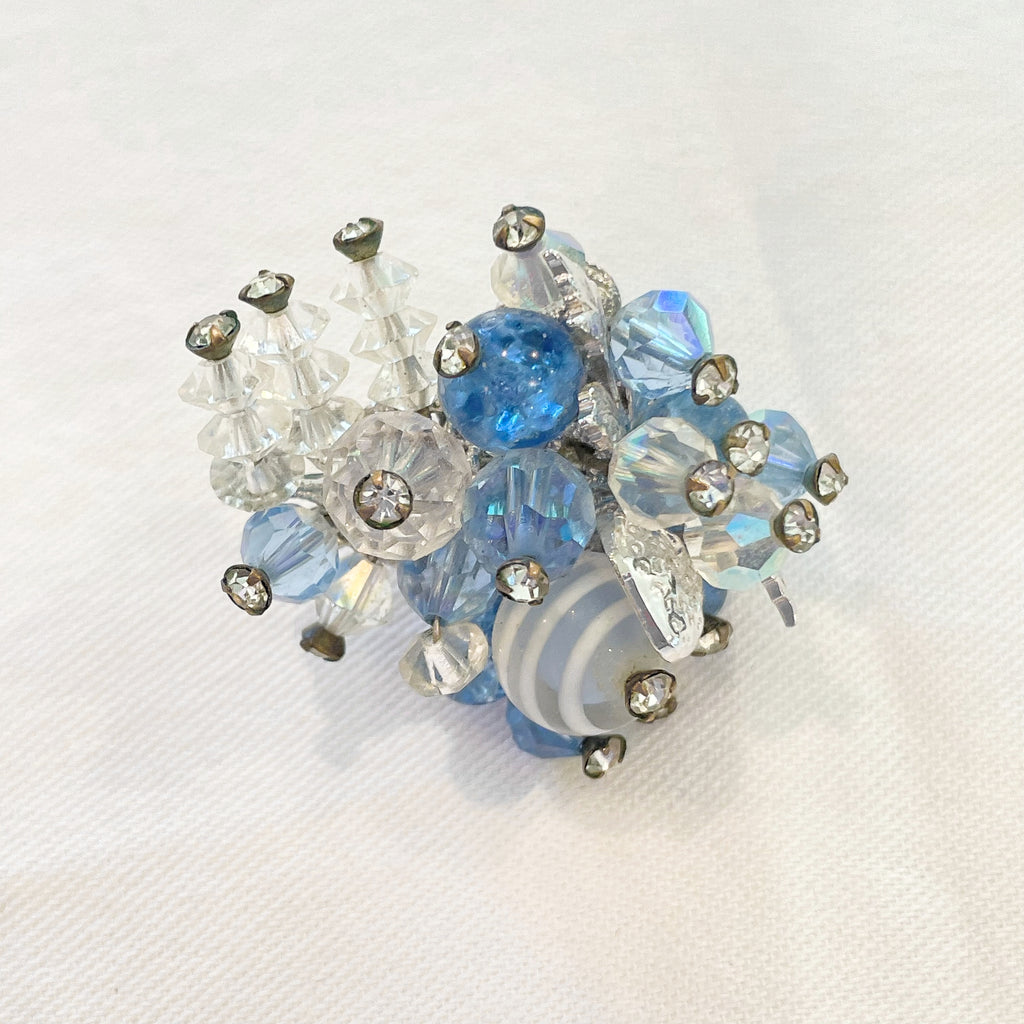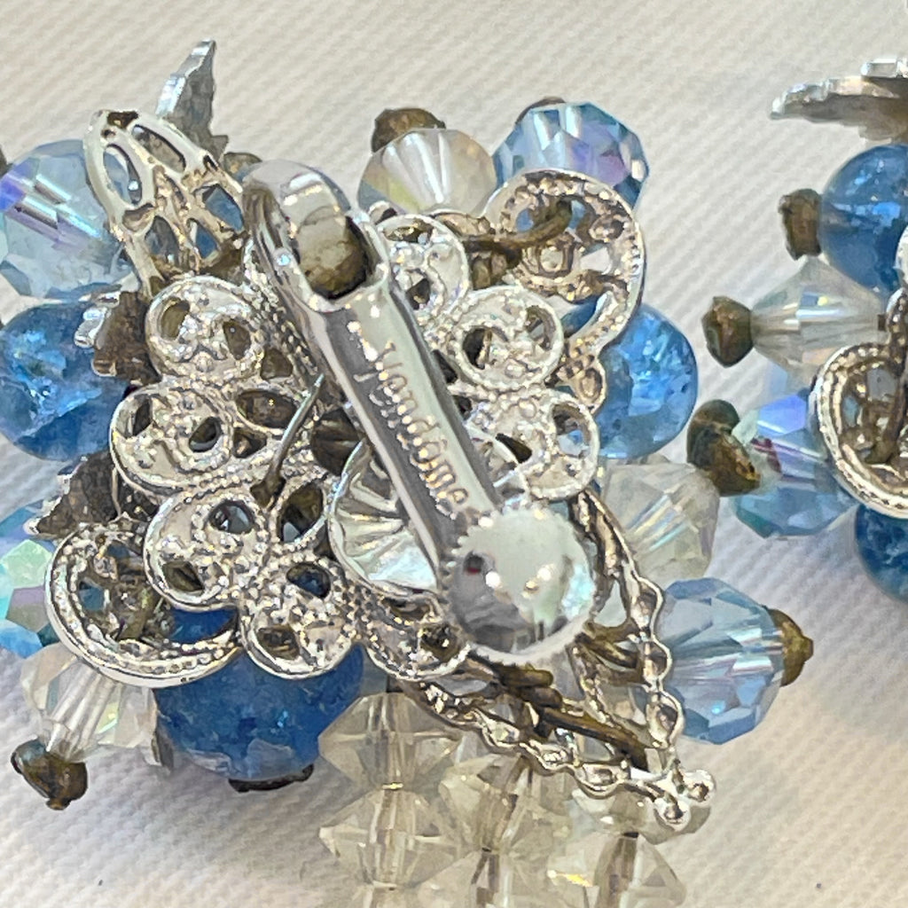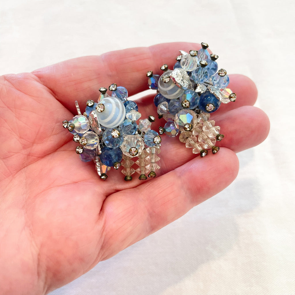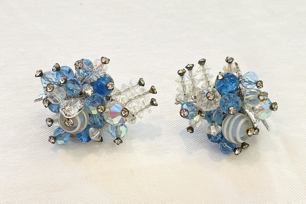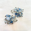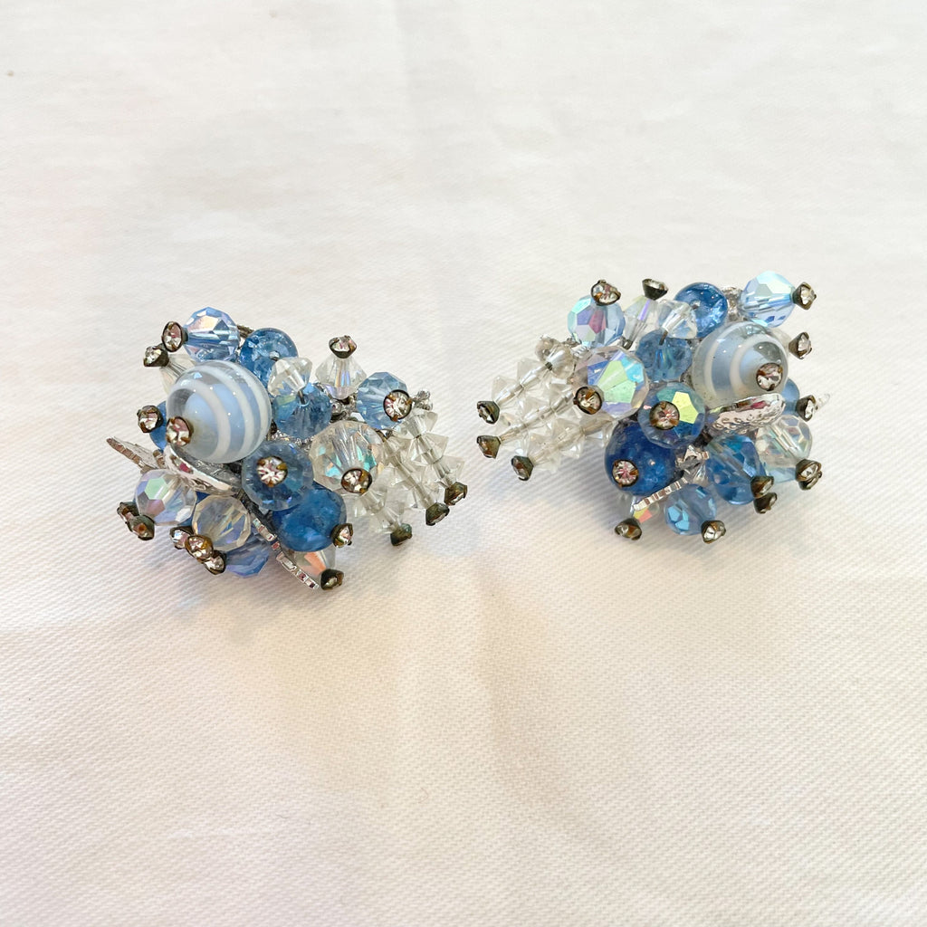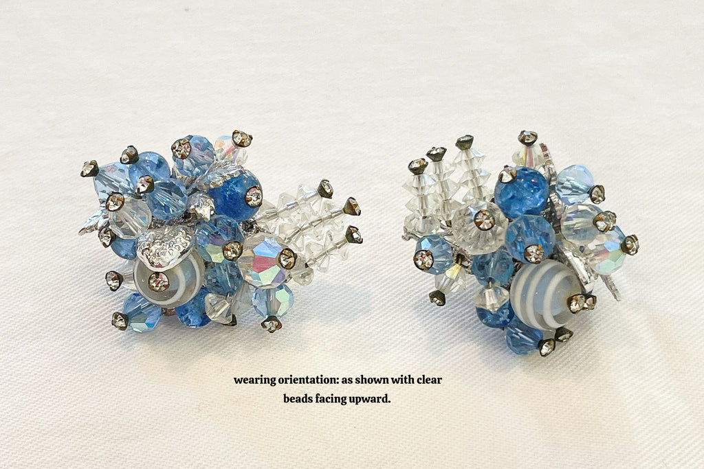 Clear and blue aurora borealis stones, faceted beads, tiny rhinestones, clip back earrings.