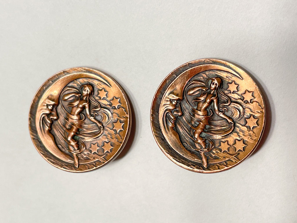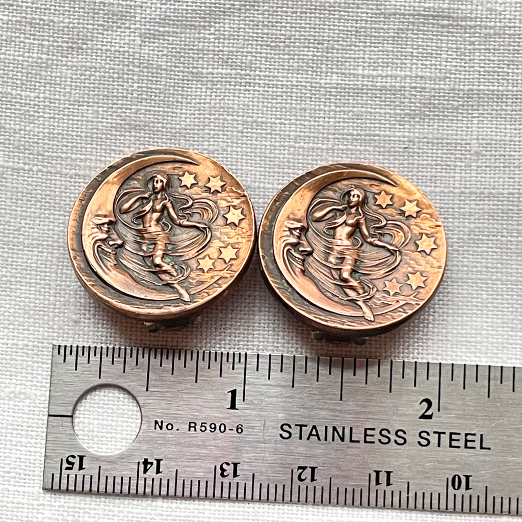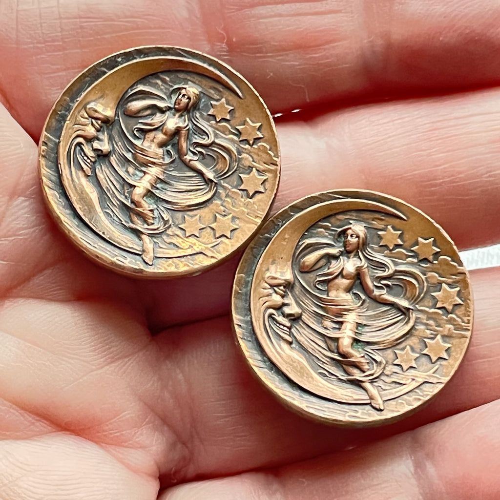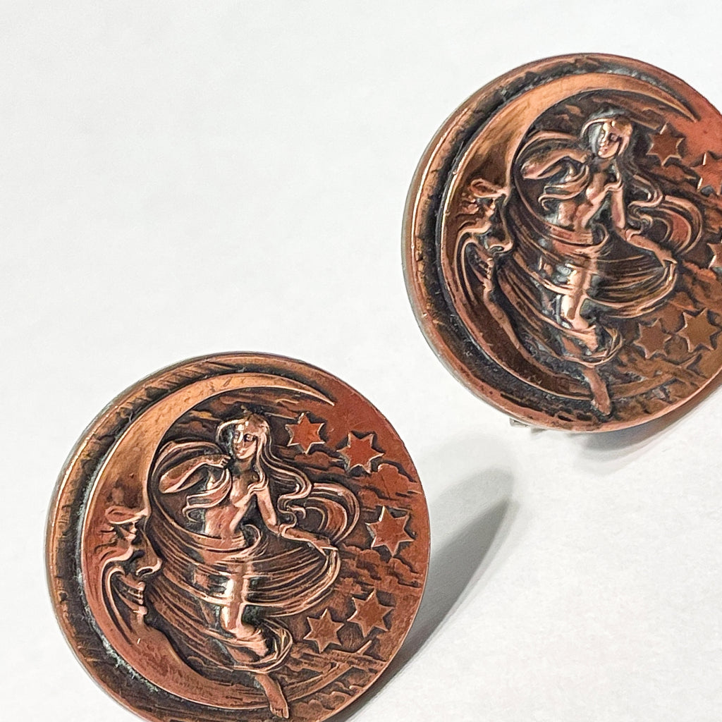 Repousse round earrings with lovely maiden, crescent man in the moon and stars.