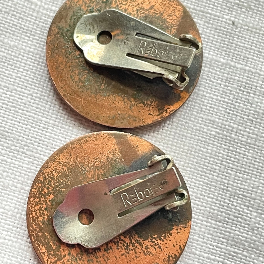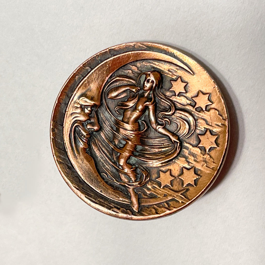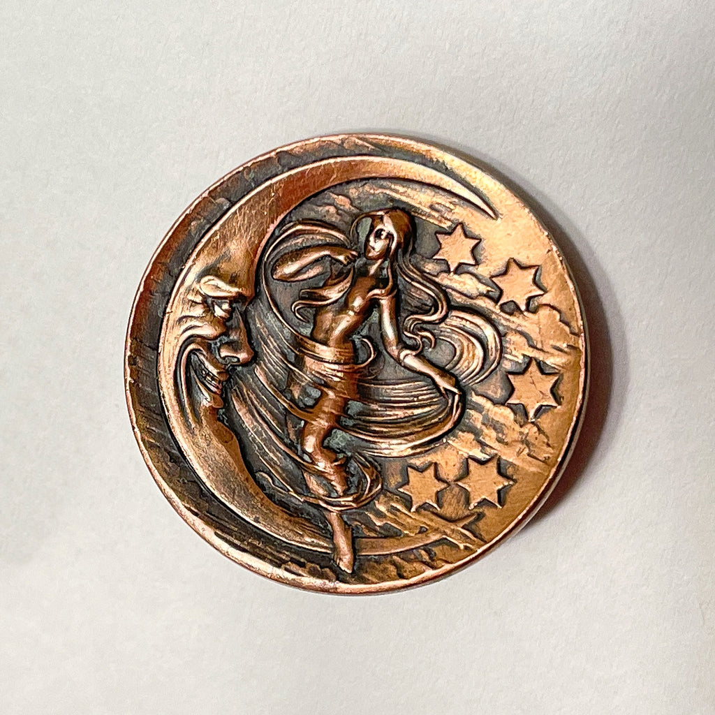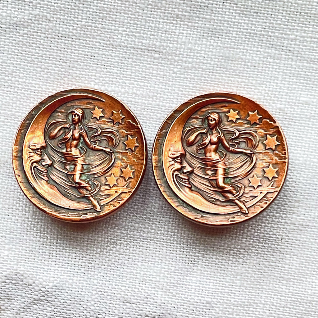 Repousse round earrings with lovely maiden, crescent man in the moon and stars.