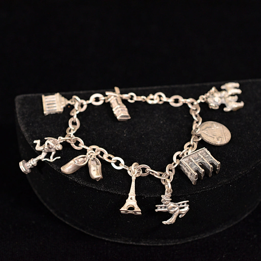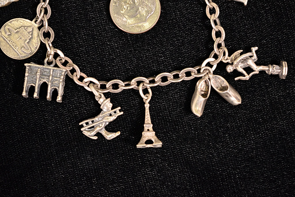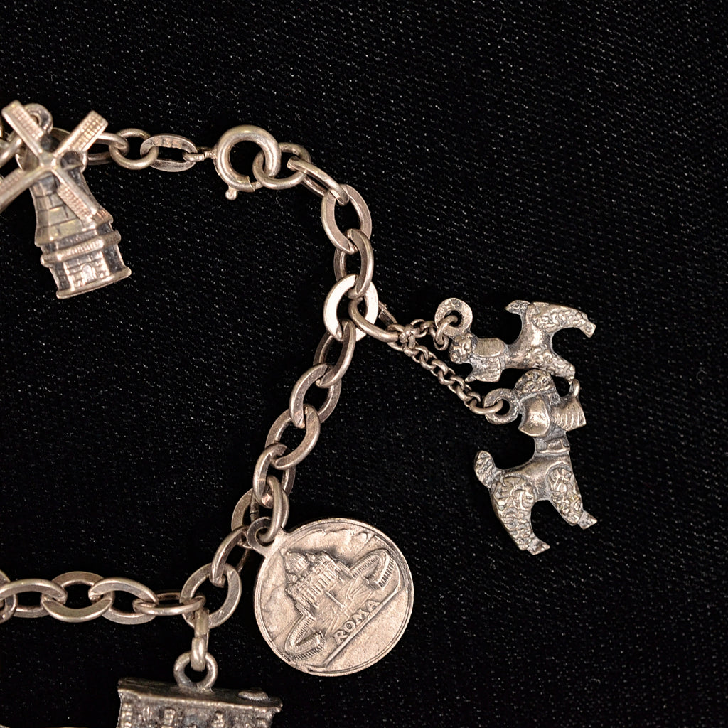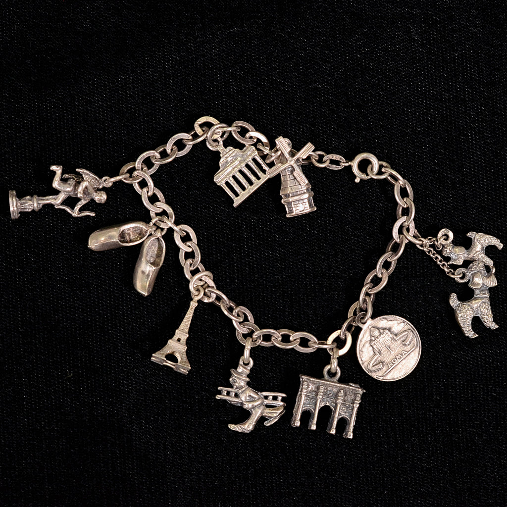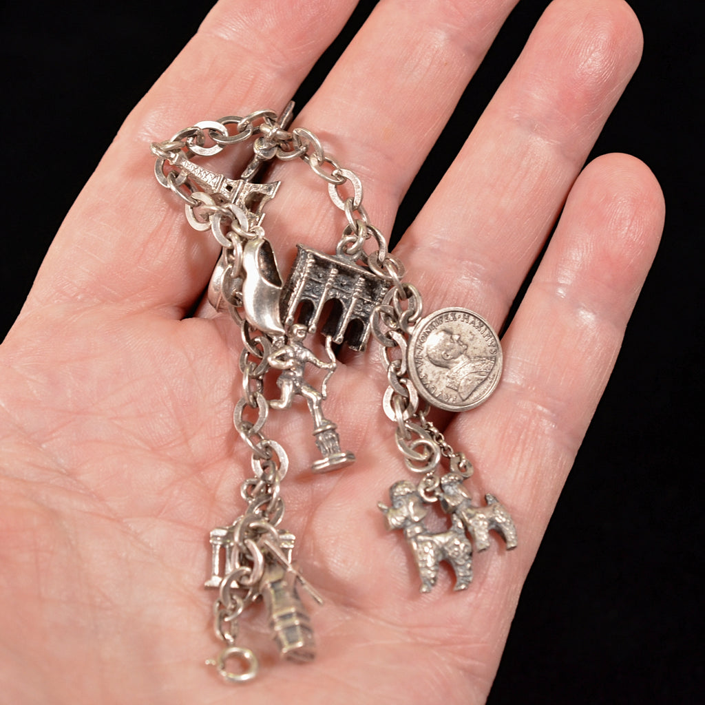 Super cute 1950s silver charm bracelet with adorable Paris/Rome/Dutch charms.