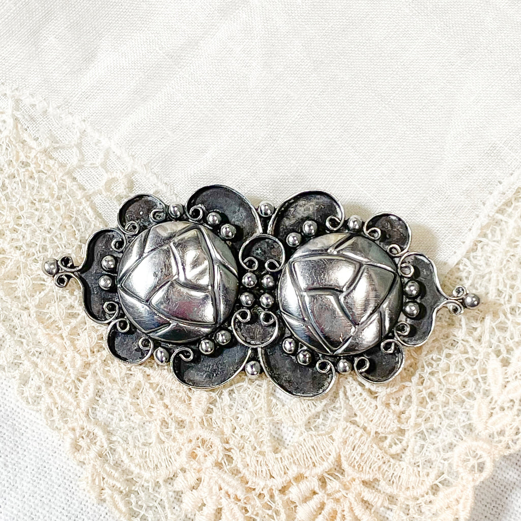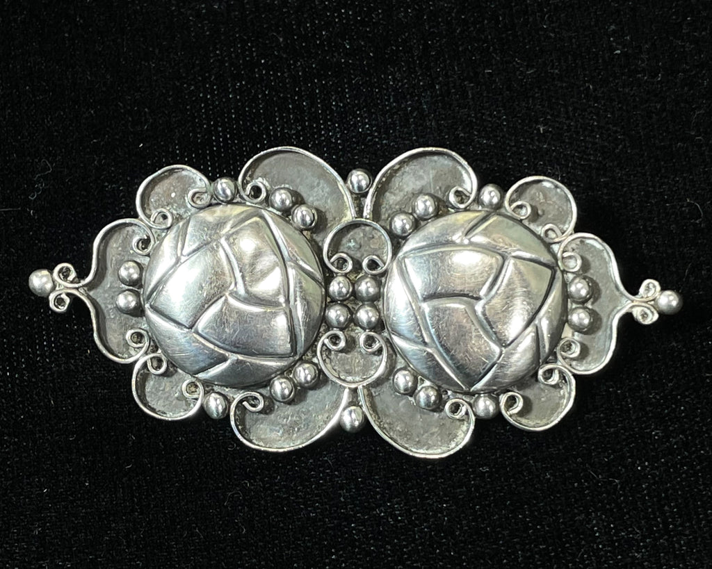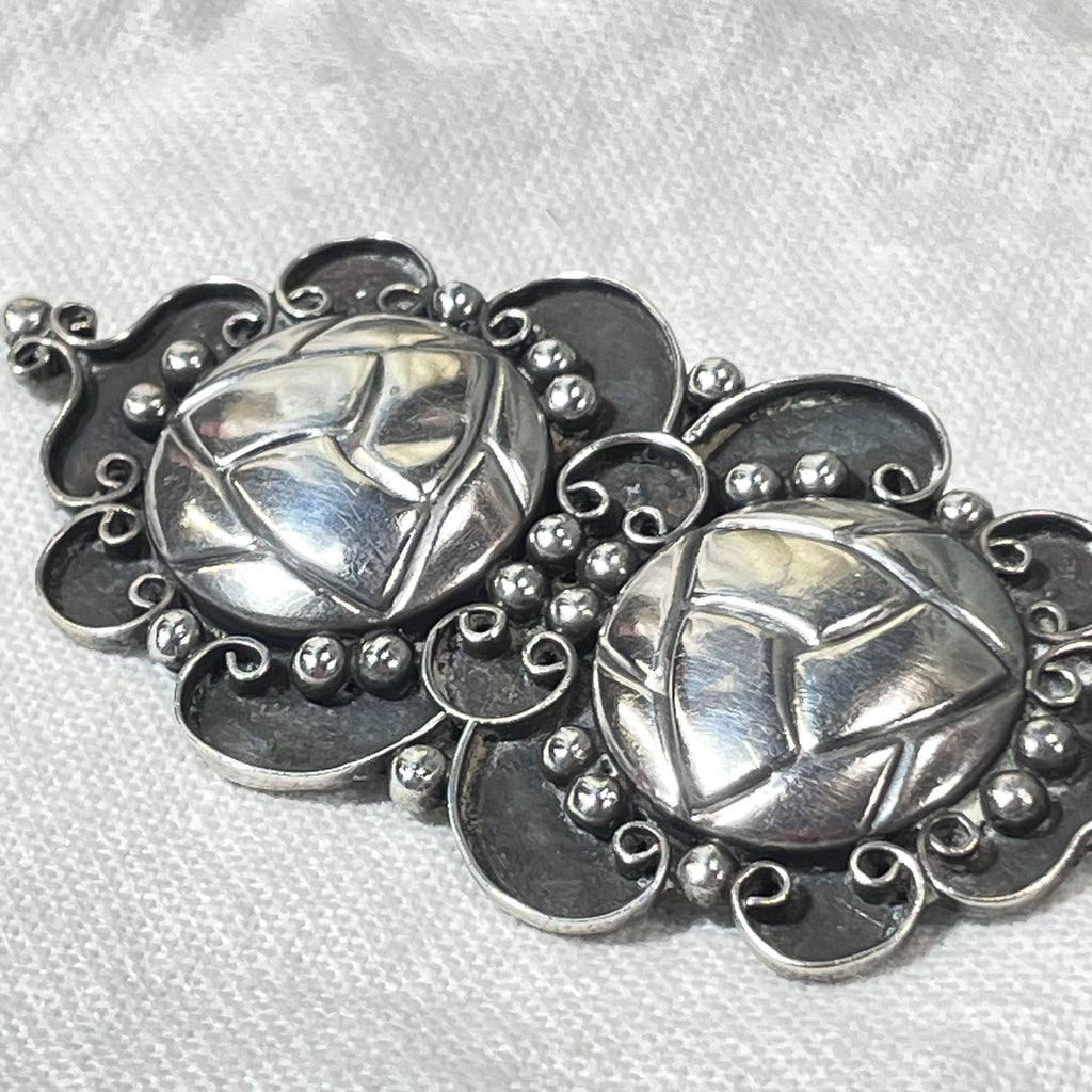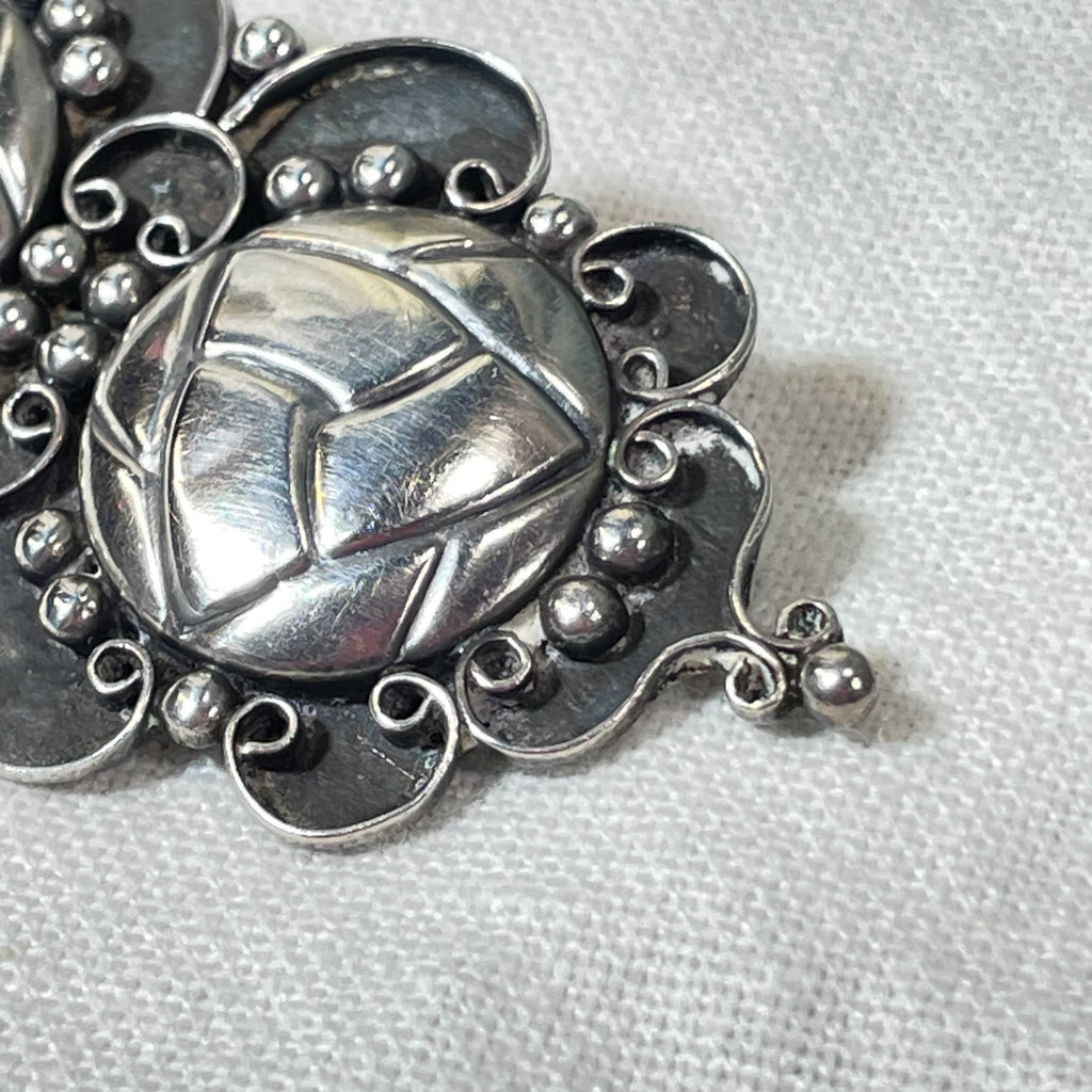 Vintage silver brooch in the Spanish Colonial style. Lovely repousse details, raised balls and swirls.