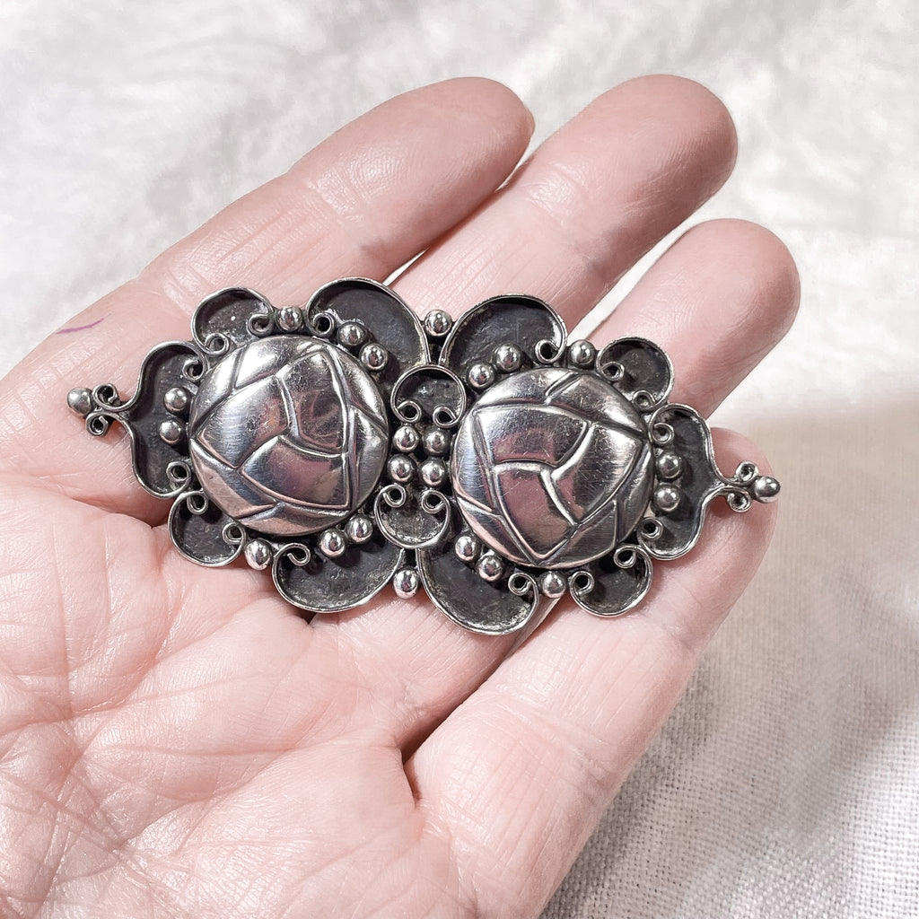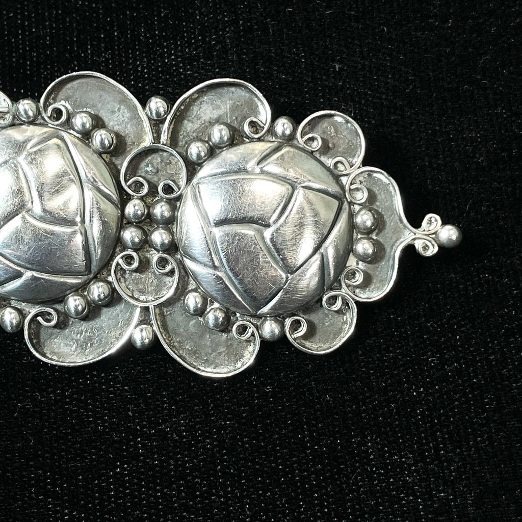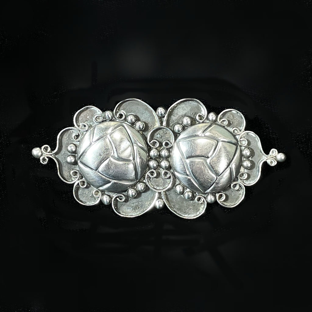 Vintage silver brooch in the Spanish Colonial style. Lovely repousse details, raised balls and swirls.