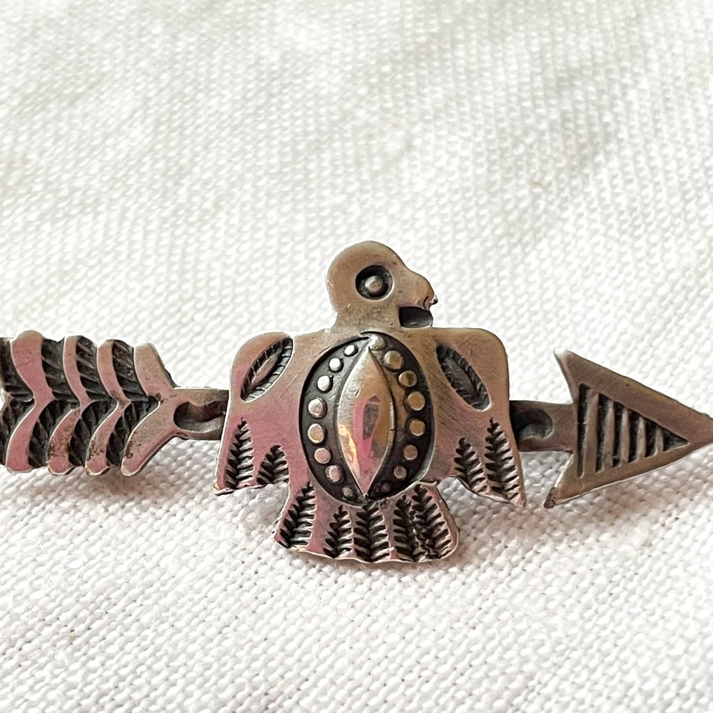 Arrow brooch with a small thunderbird in the center. The bird has a raised chest.