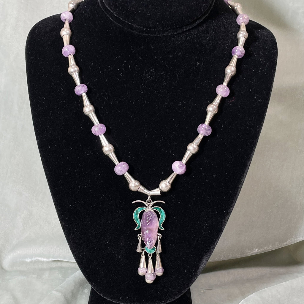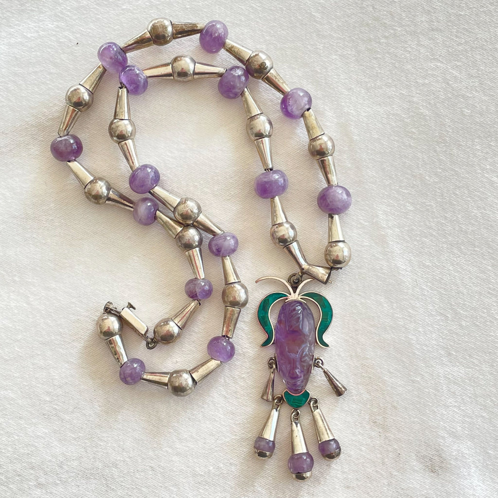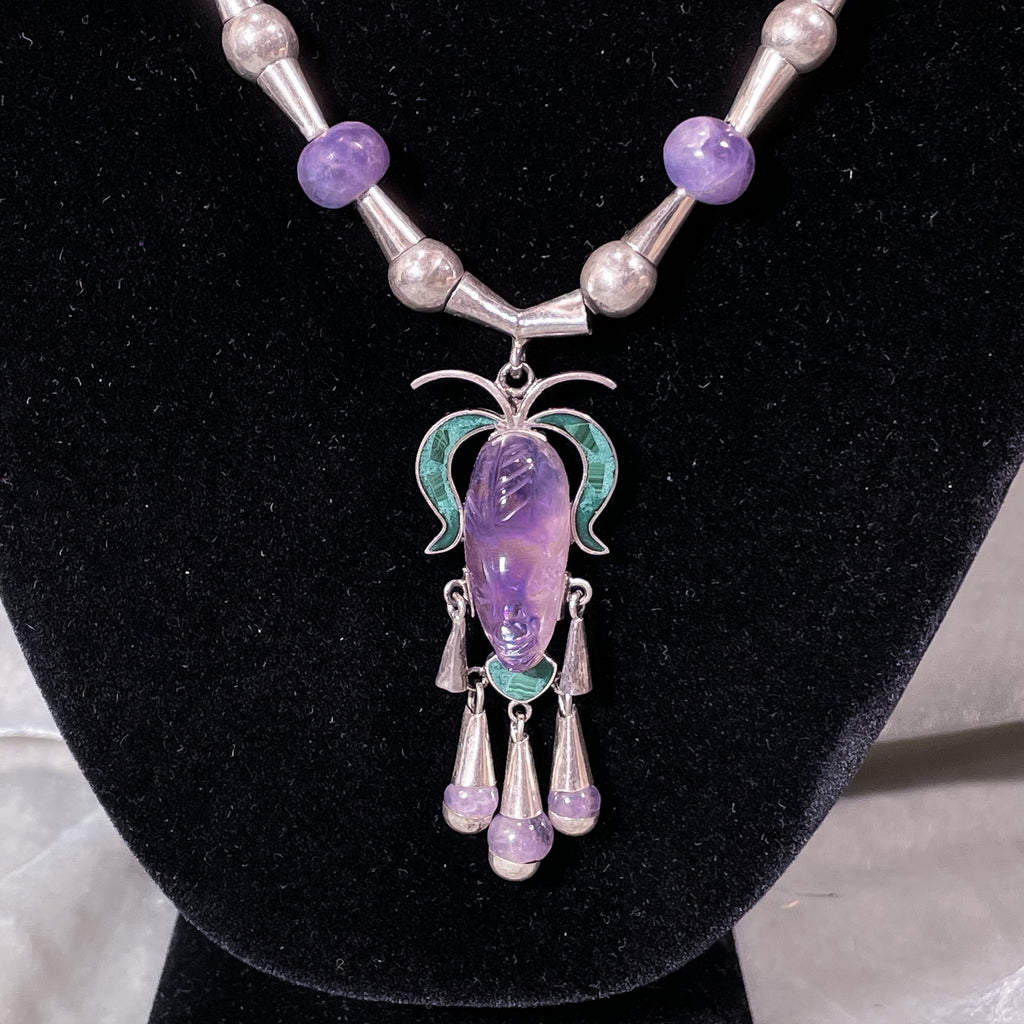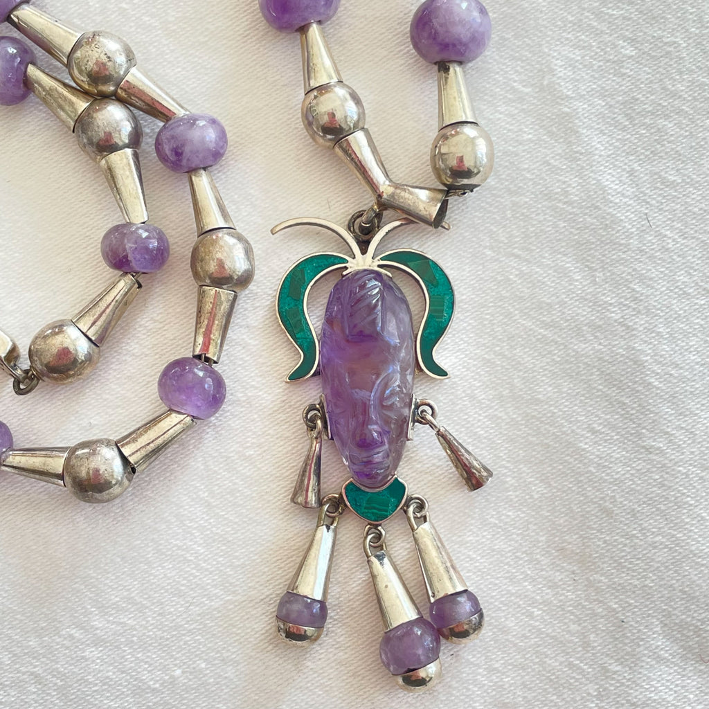 Handmade necklace, silver and amethyst carved face & beads, malachite inlay details.