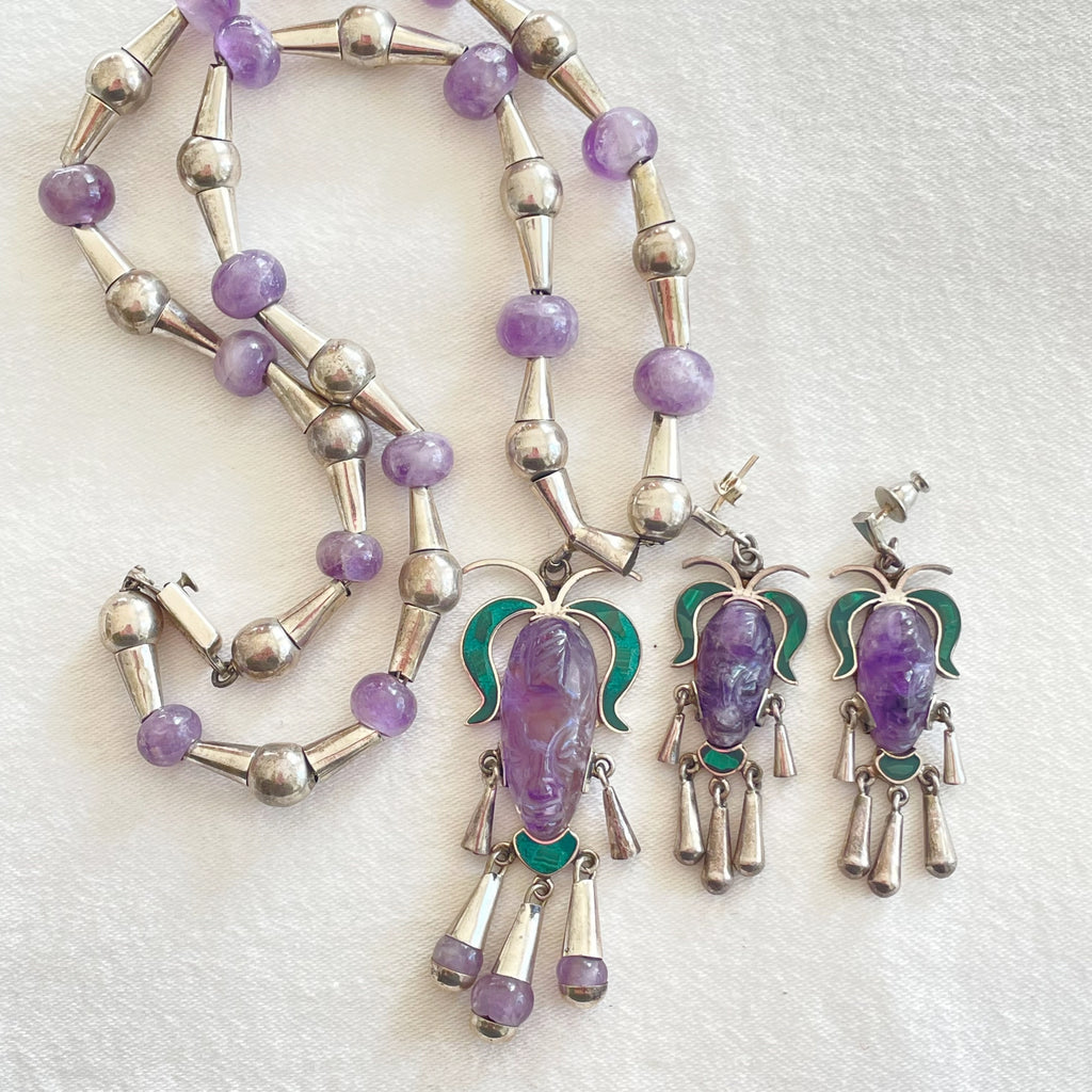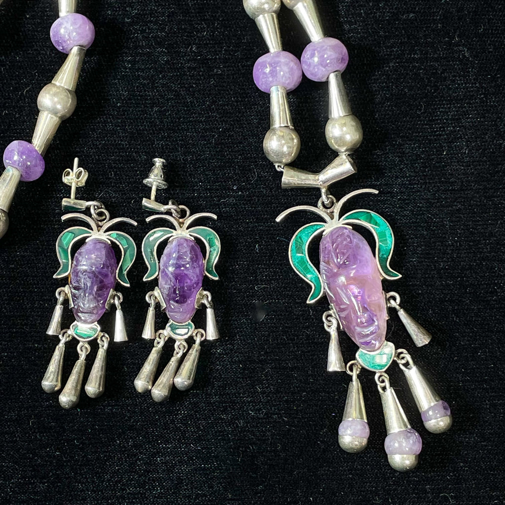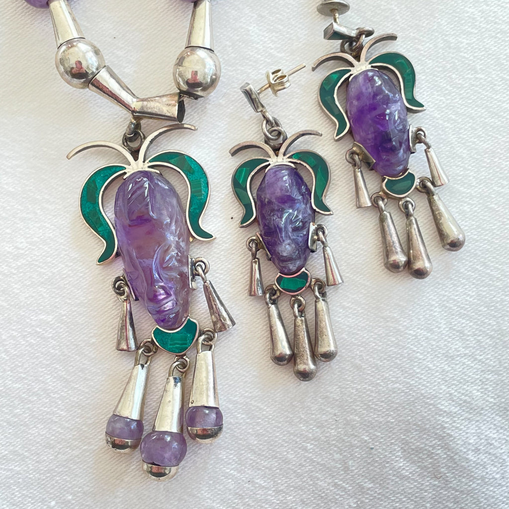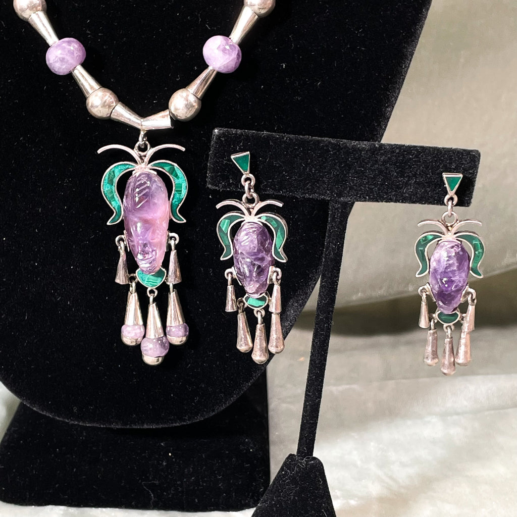 Handmade necklace, silver and amethyst carved face & beads, malachite inlay details.