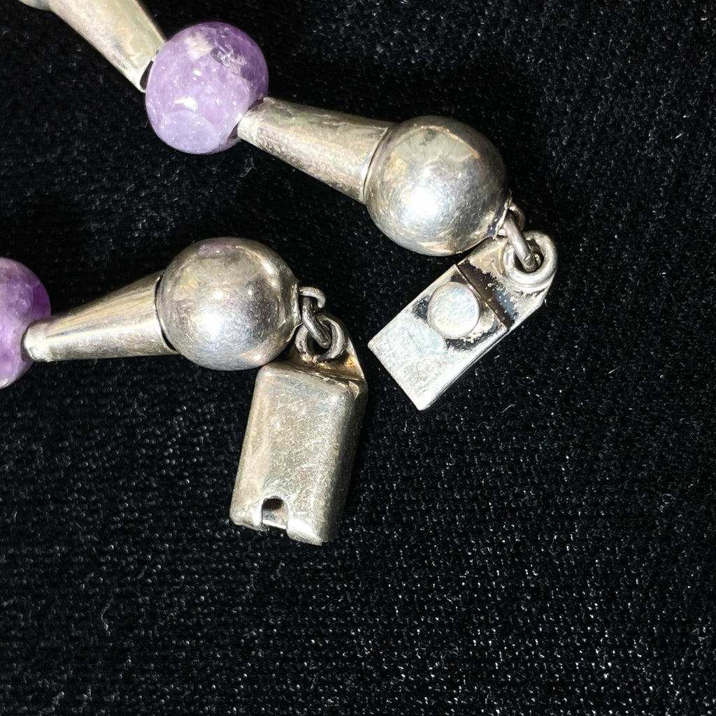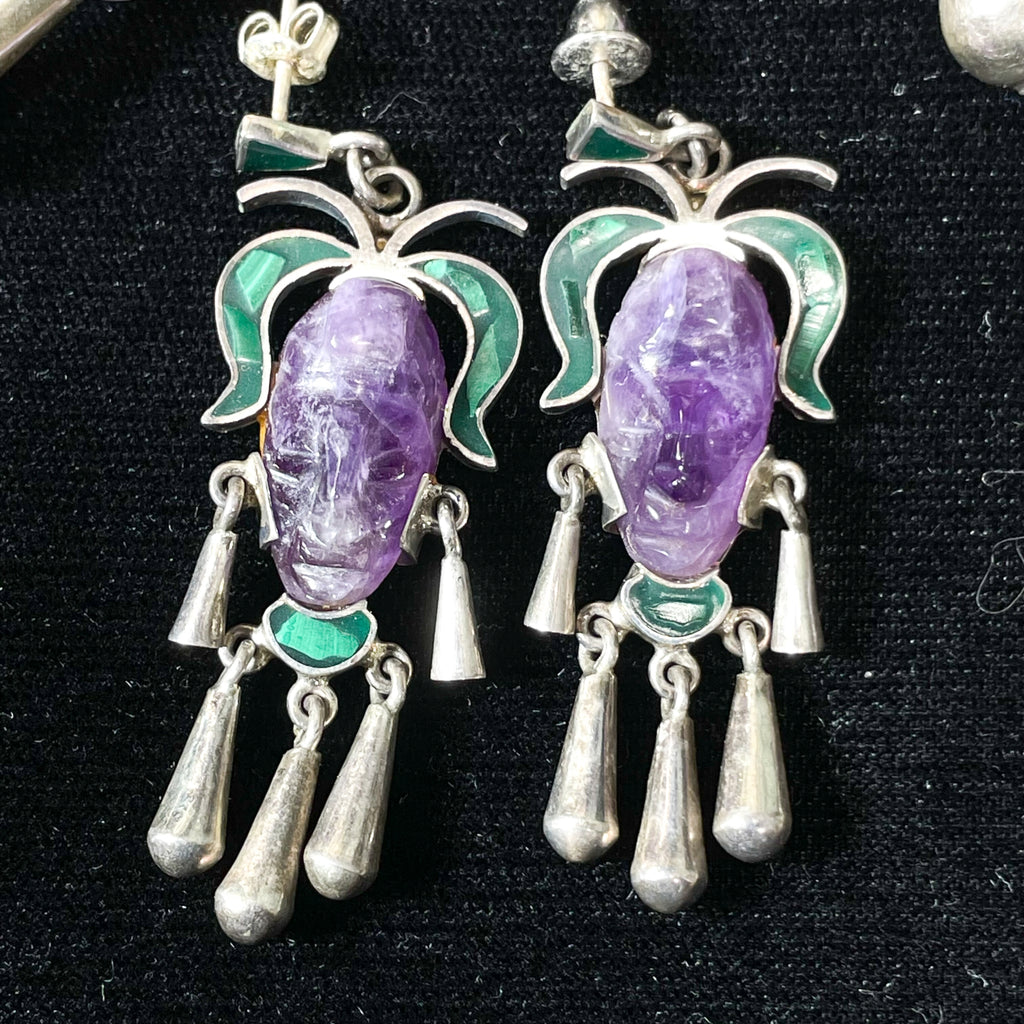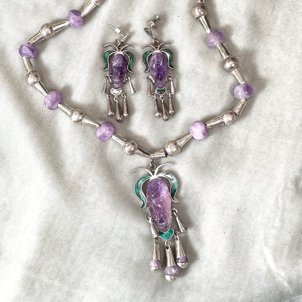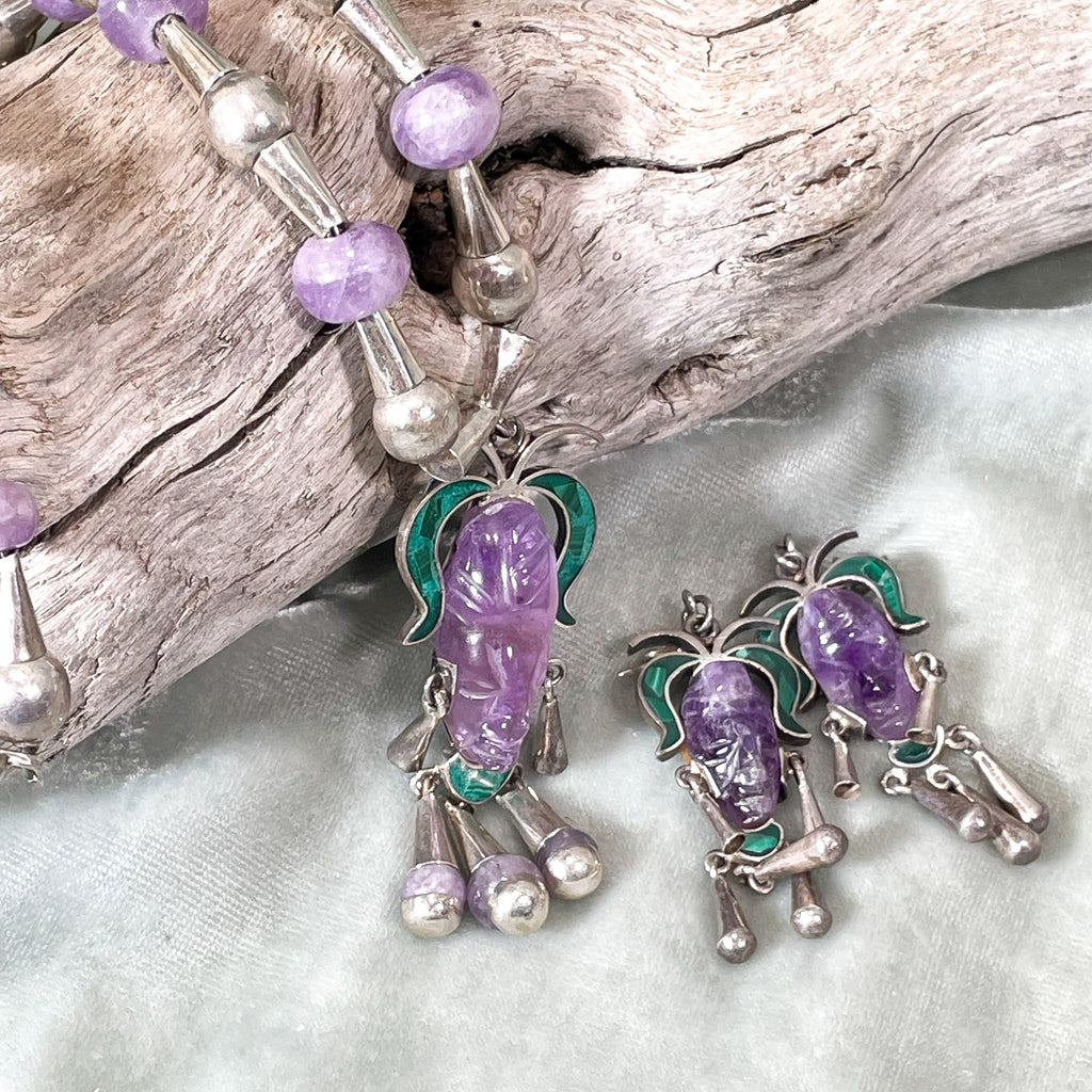 Handmade necklace, silver and amethyst carved face & beads, malachite inlay details.