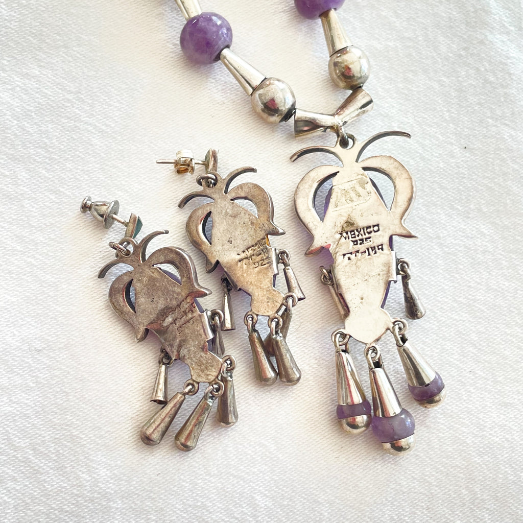 Vintage sterling silver made in Mexico pendant necklace with matching earrings. Aztec/Mayan design.