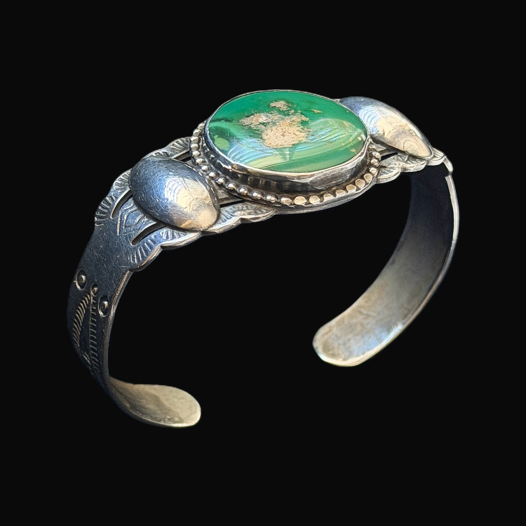 Round green turquoise stone in the center of the bracelet, flanked by oval raised silver beads, stamping on the sides of the bracelet. Some photos taken on images shown from Fred Harvey book to illustrate stamping.