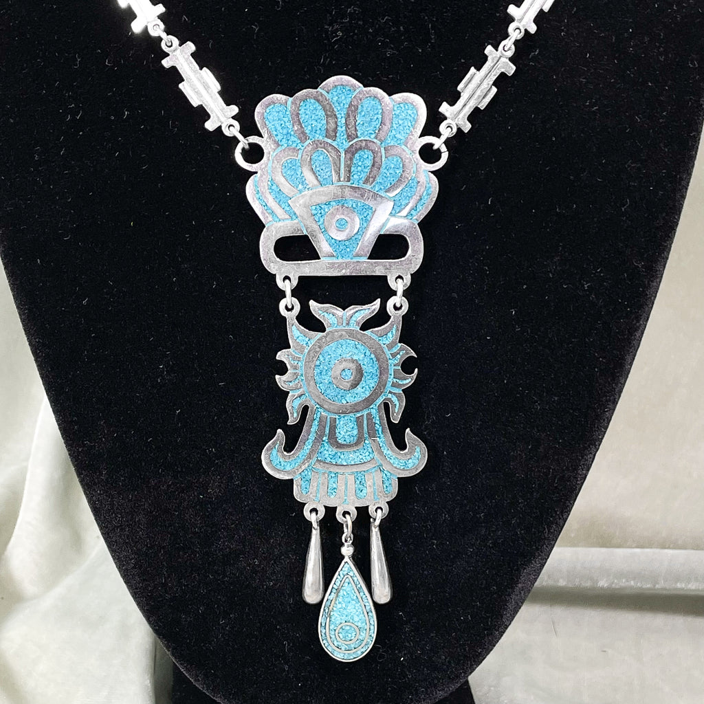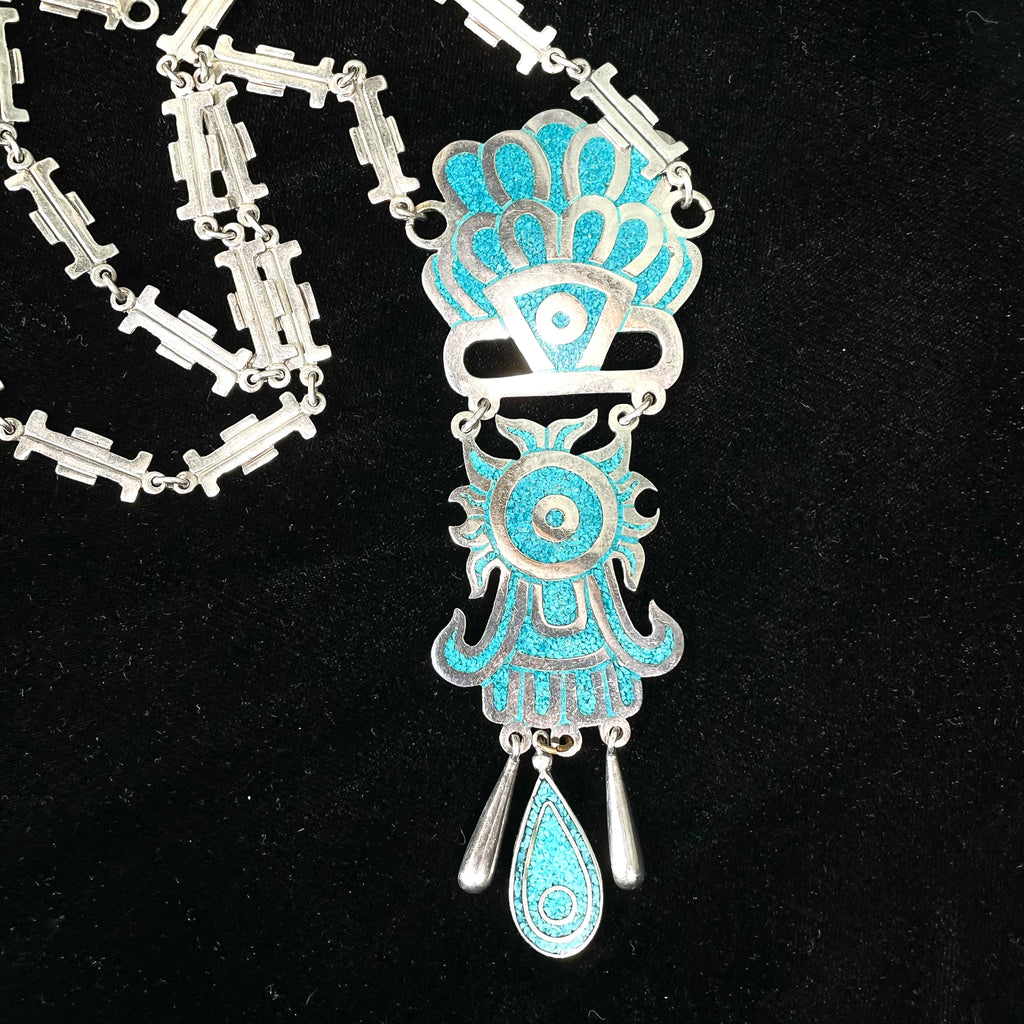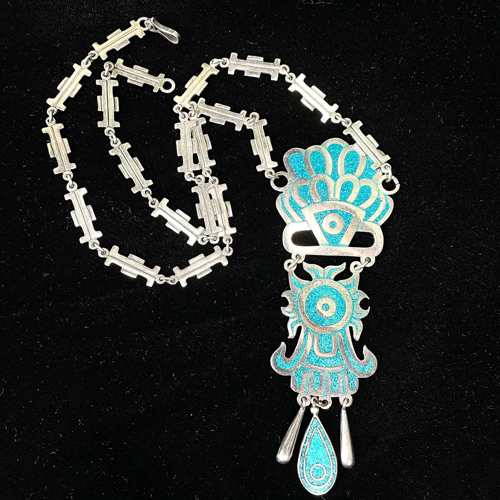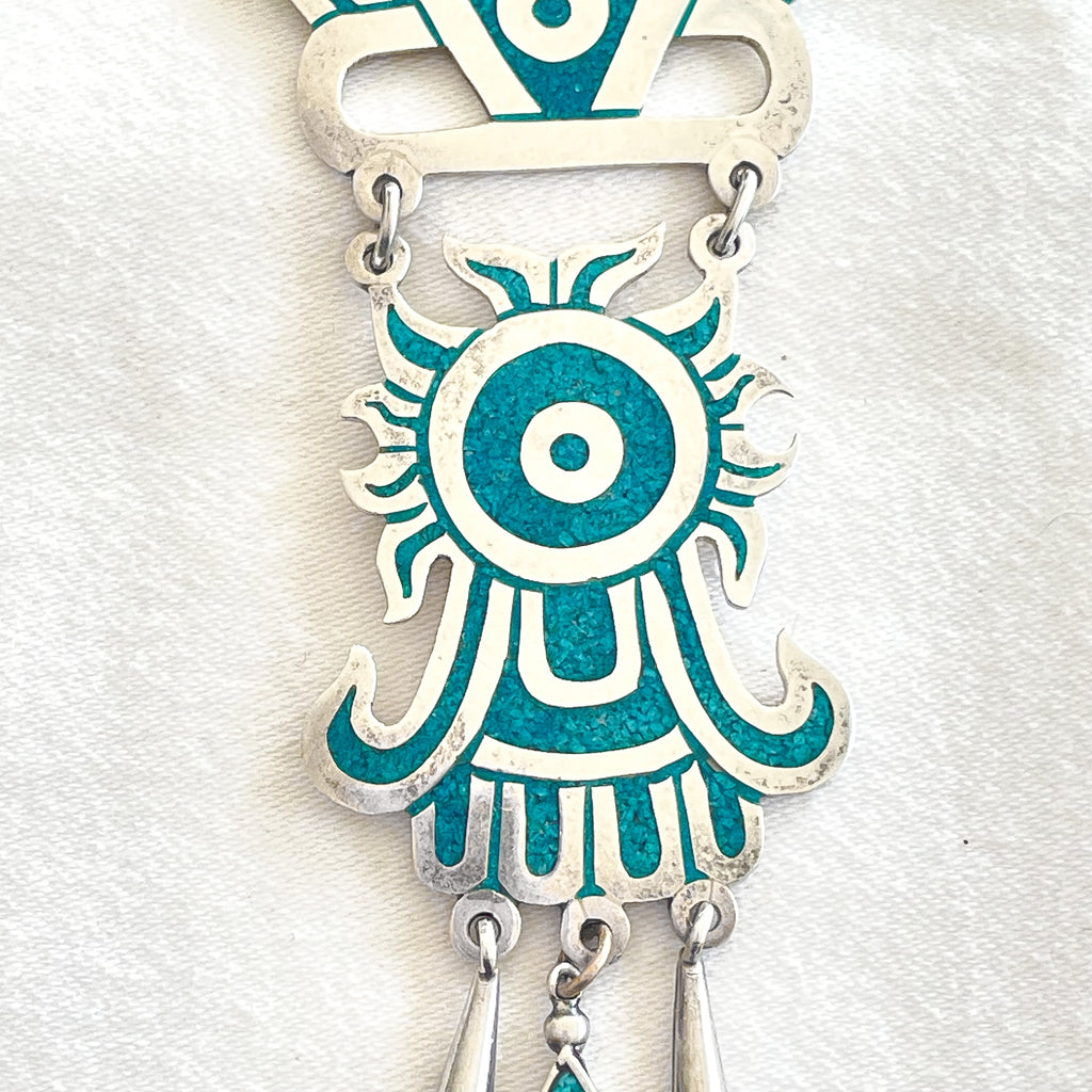 SOLD Vintage Taxco Sterling Silver Turquoise Mayan Pendant Statement Necklace