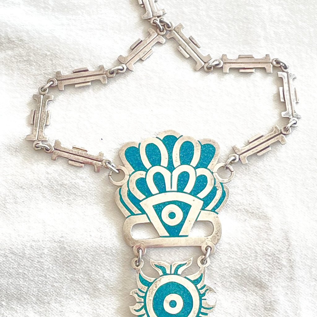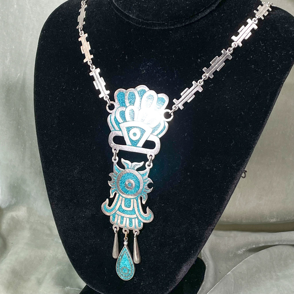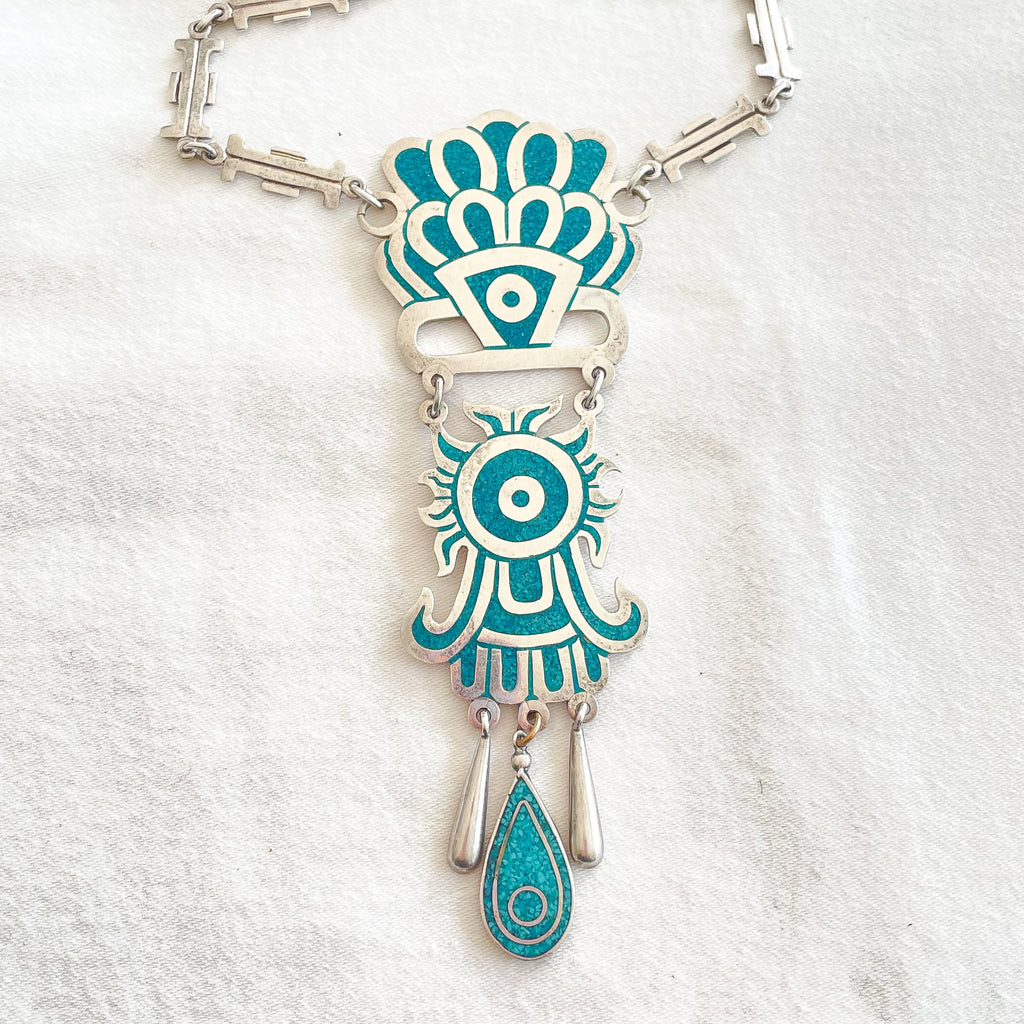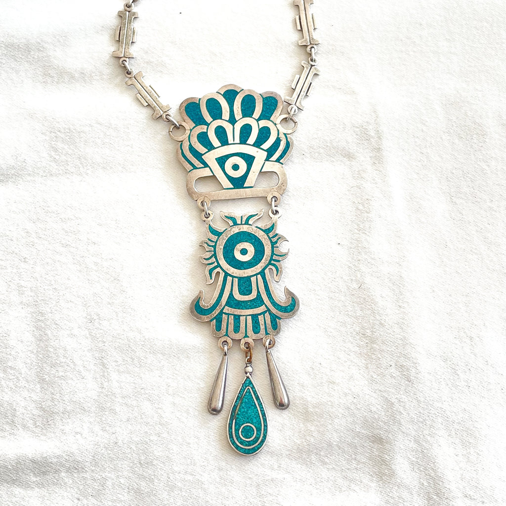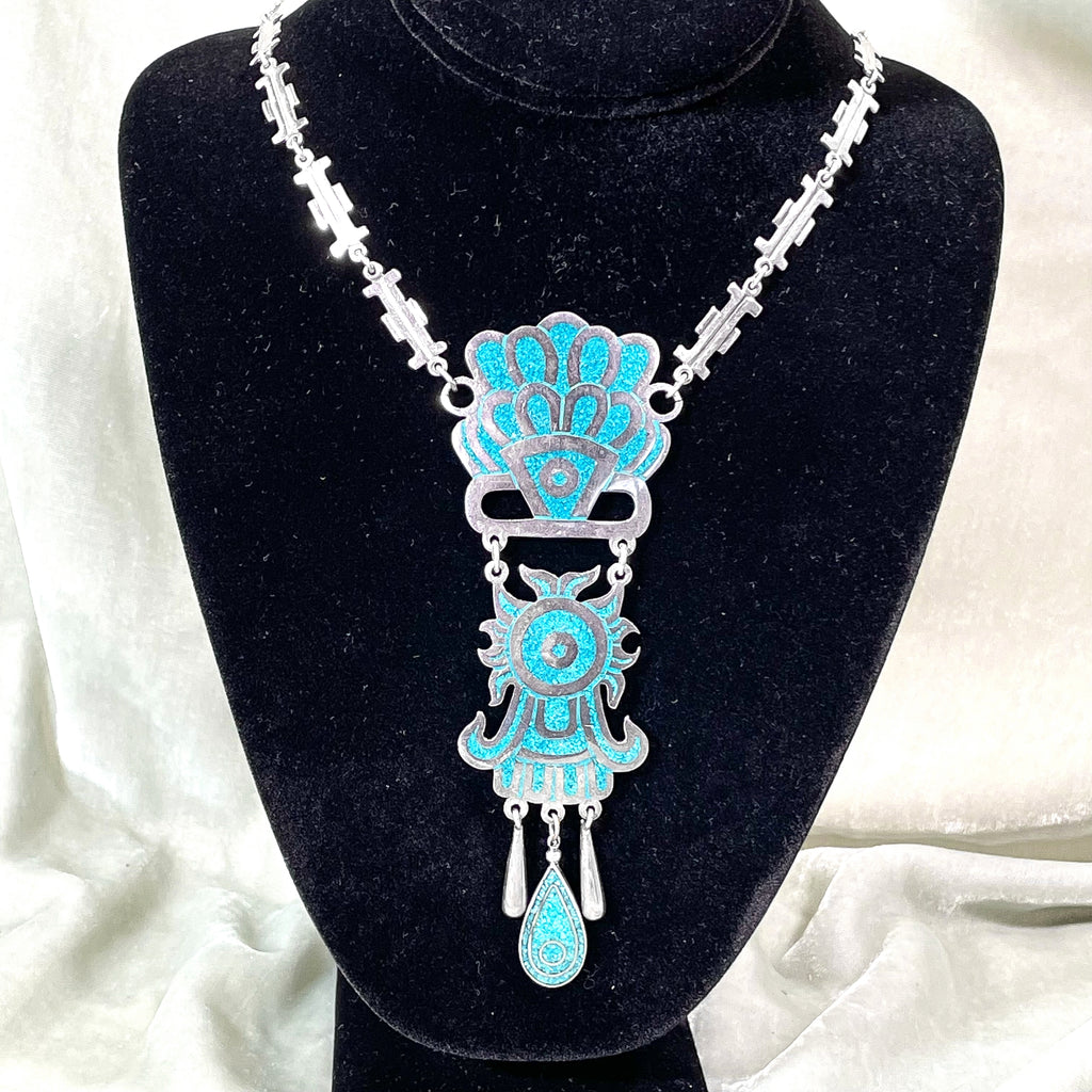 SOLD Vintage Taxco Sterling Silver Turquoise Mayan Pendant Statement Necklace