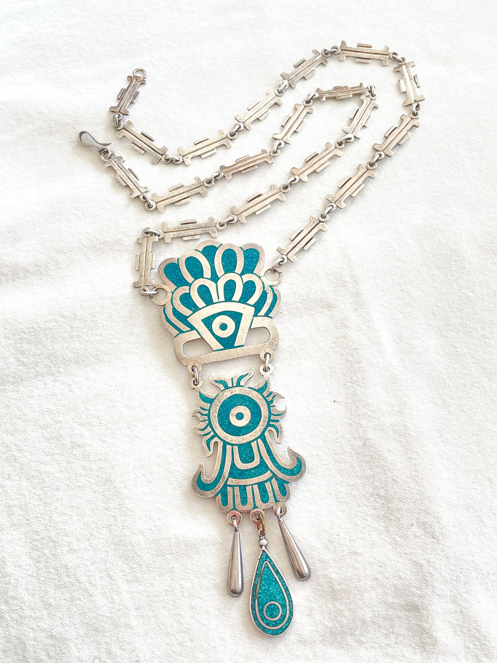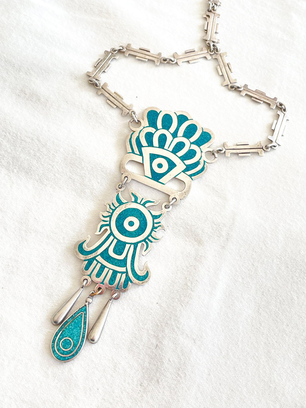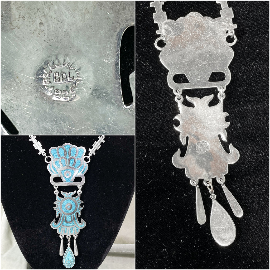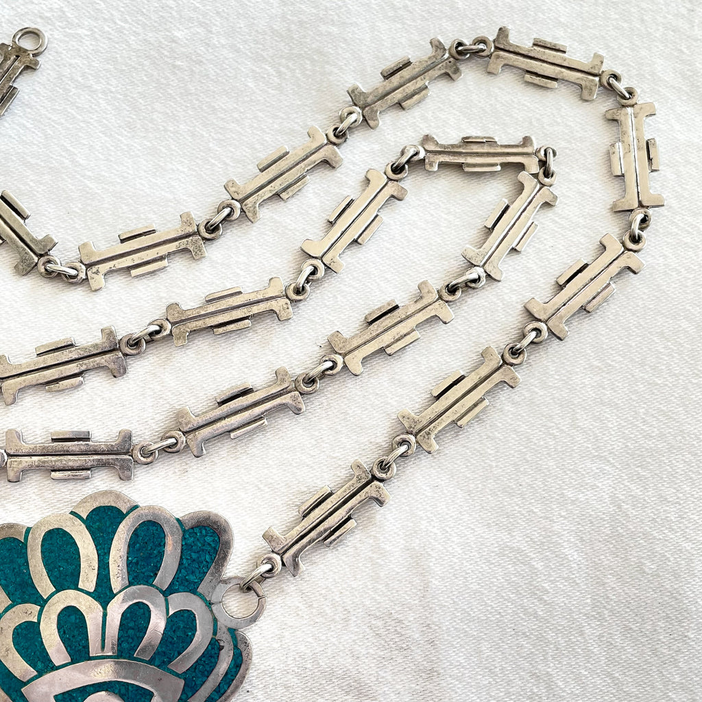 SOLD Vintage Taxco Sterling Silver Turquoise Mayan Pendant Statement Necklace