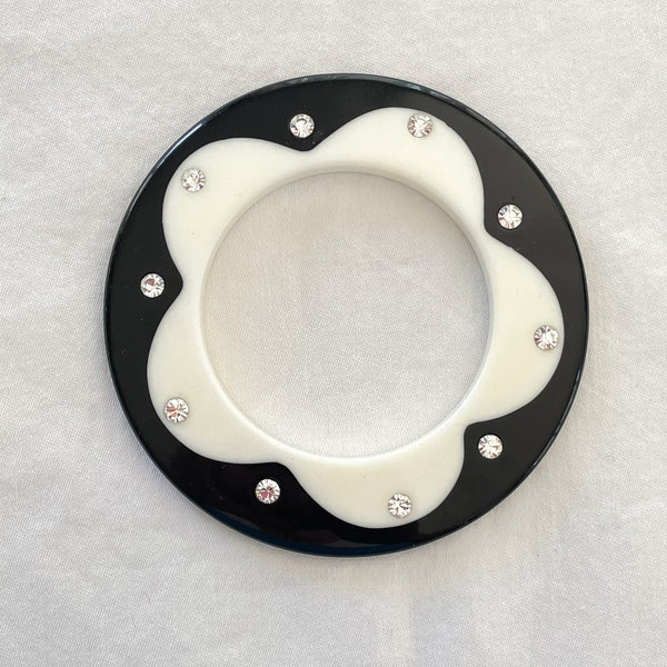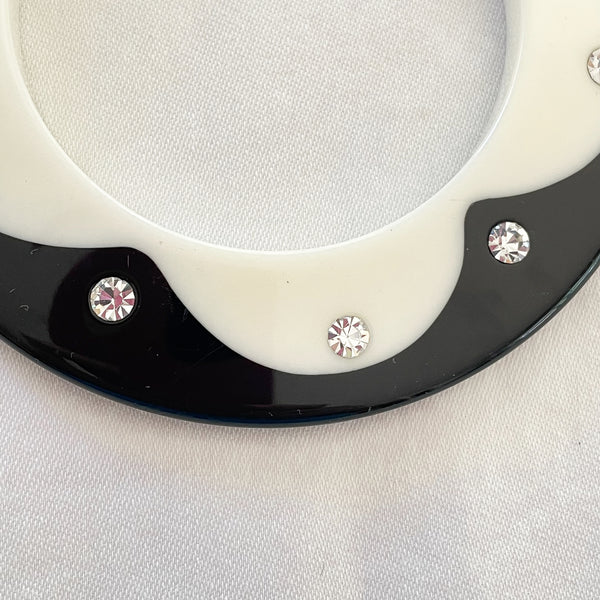 SOLD Black White Rhinestone Lucite Bangle Bracelet, Modernist Avante Garde Bracelet