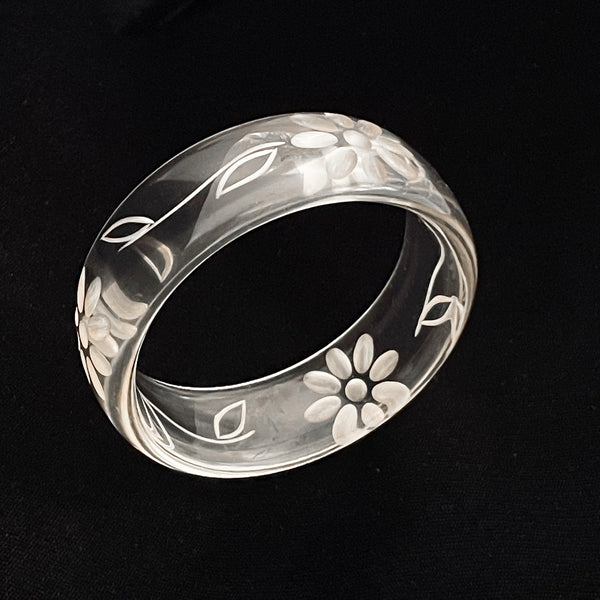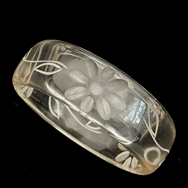 Vintage Clear Lucite Carved Floral Bangle Bracelet