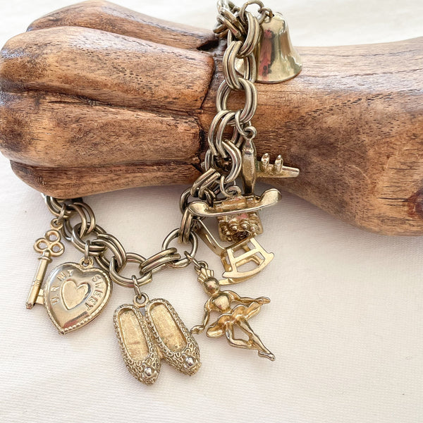 SOLD Vintage Coro Gold Tone Charm Bracelet, Dancer Boat, Hearts + More 7 1/2" L