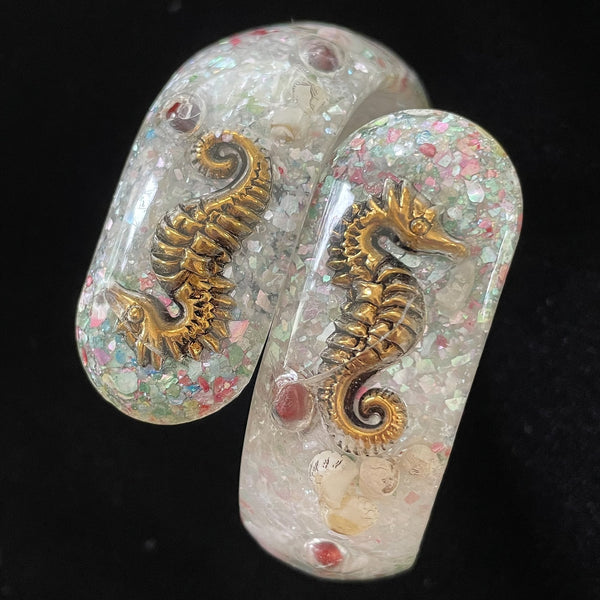 Vintage 60s Lucite Confetti Seahorse Seashell Clamper Bracelet 6"