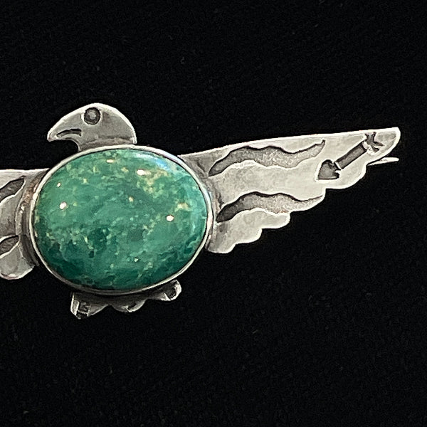 Vintage Sterling Silver Turquoise Thunderbird Brooch, Fred Harvey Era Pin 2 1/4" L
