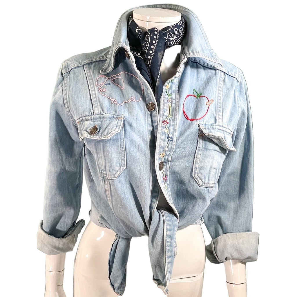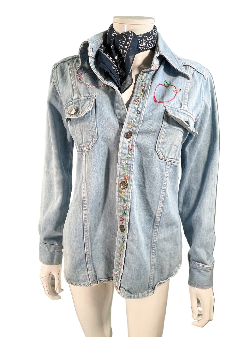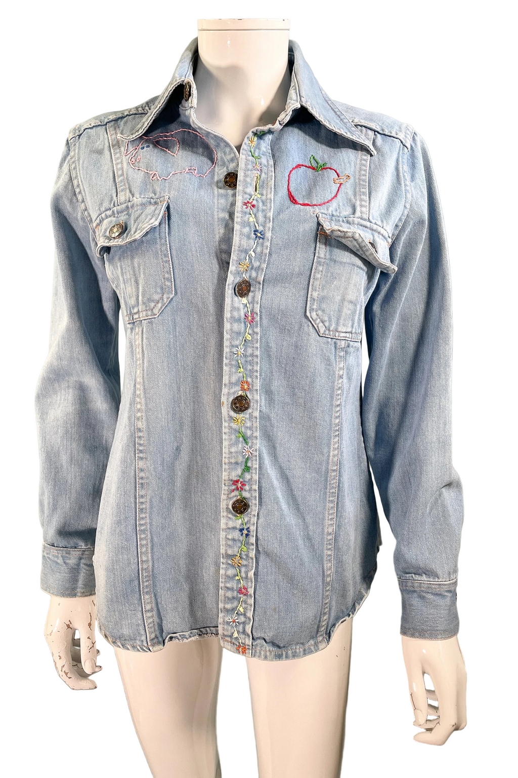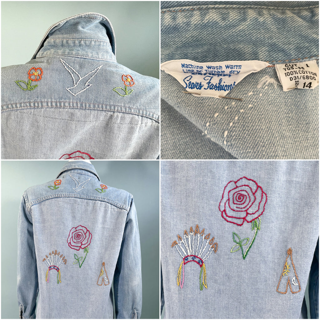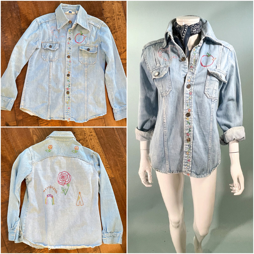 Vintage 70s cotton denim shirt/blouse with hand stitched OOAK embroidery.