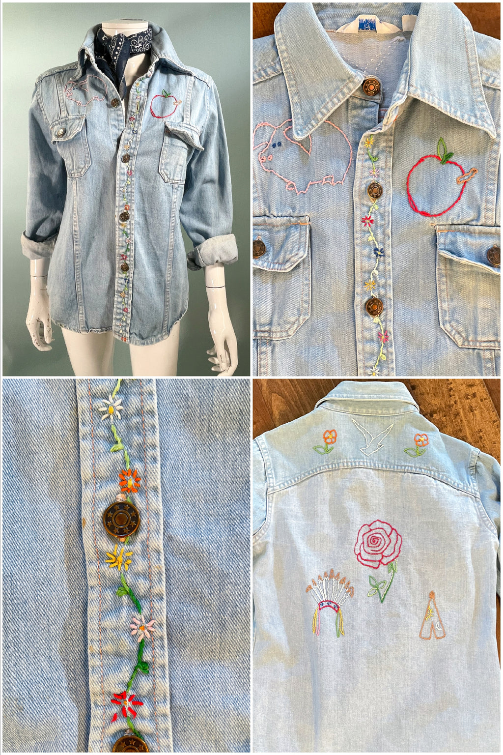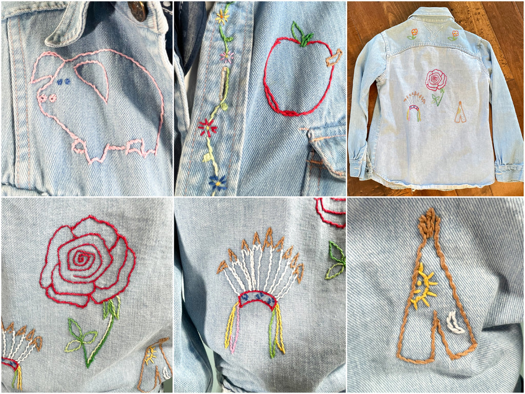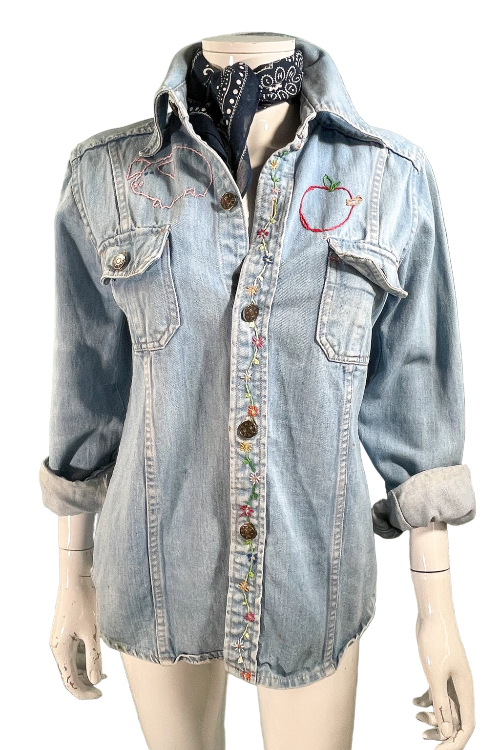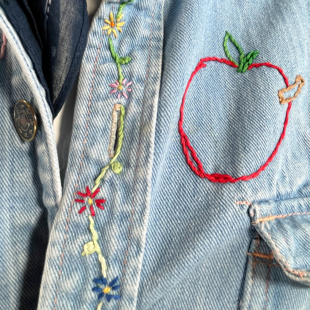 Vintage 70s cotton denim shirt/blouse with hand stitched OOAK embroidery.
