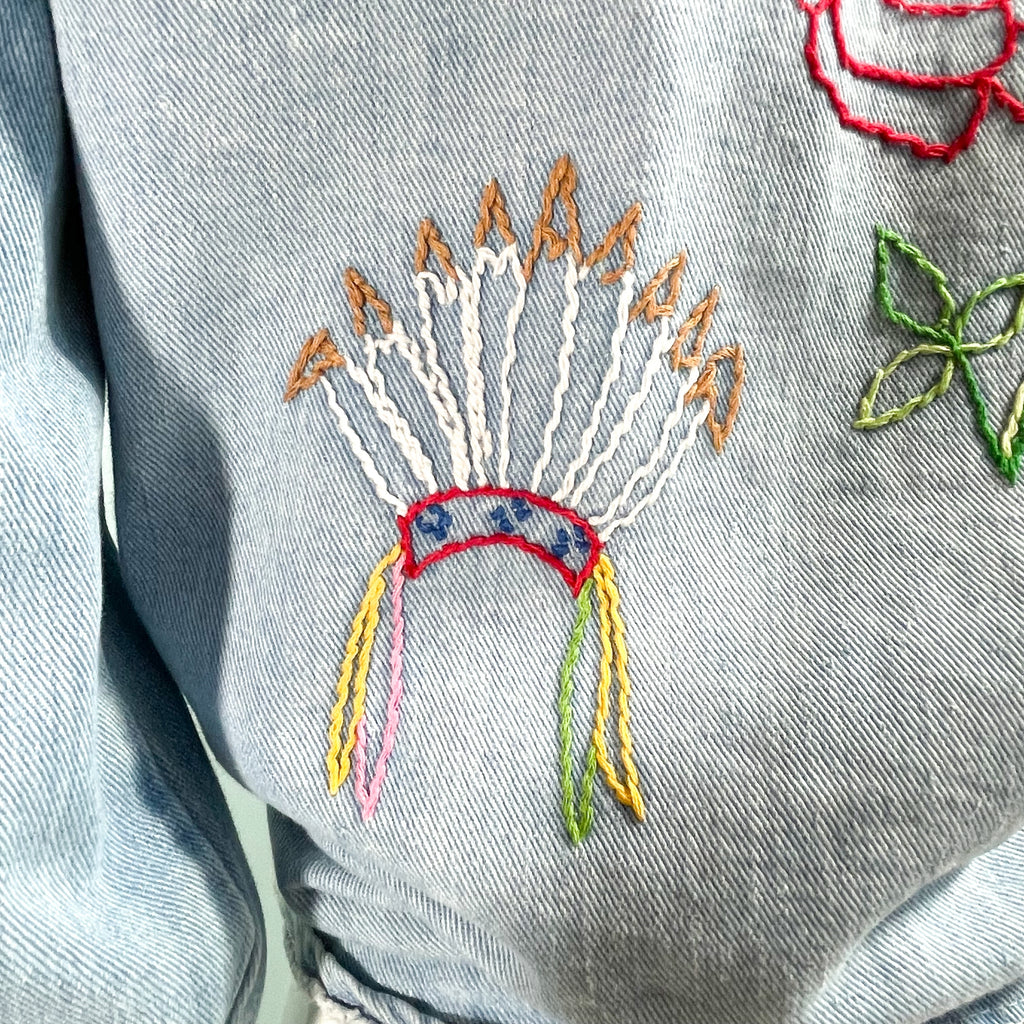 Embroidered front and back: pig, apple, flowers, dove, Indian headdress, tee pee.