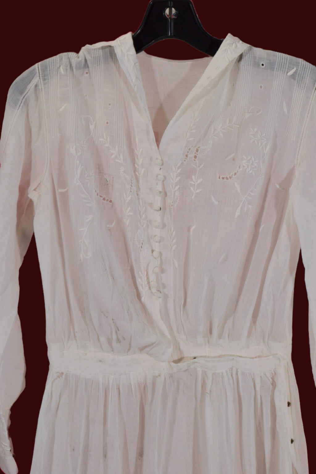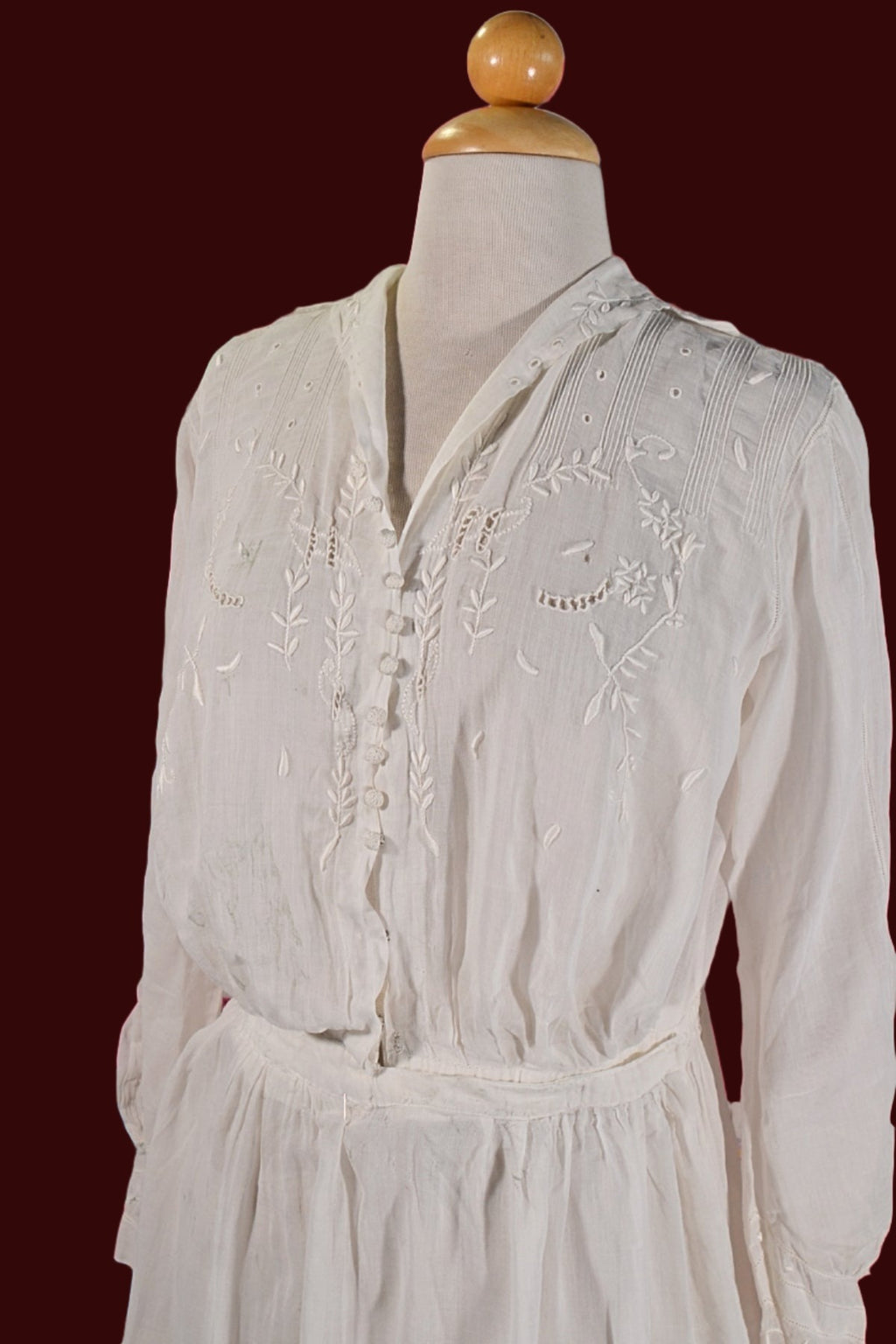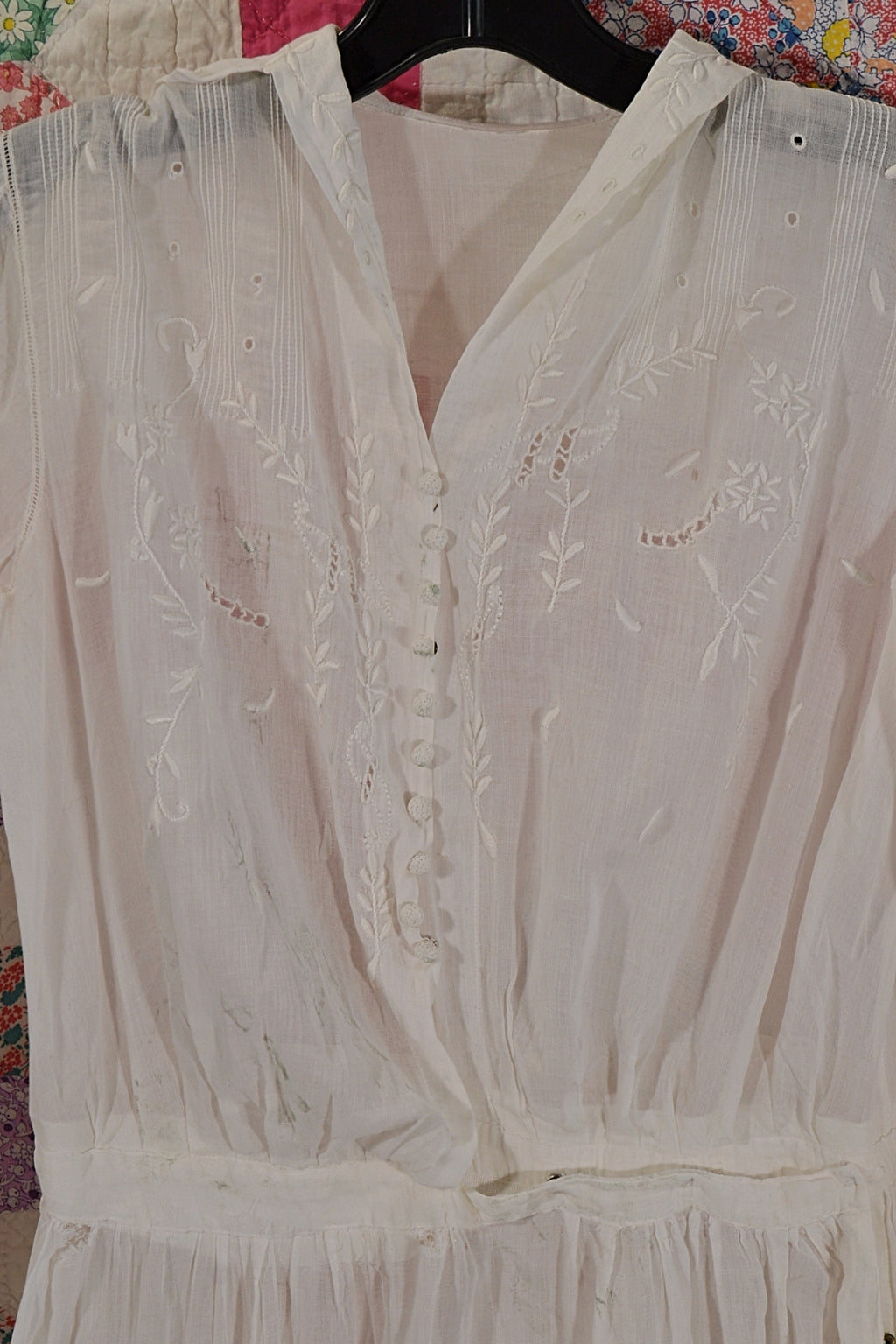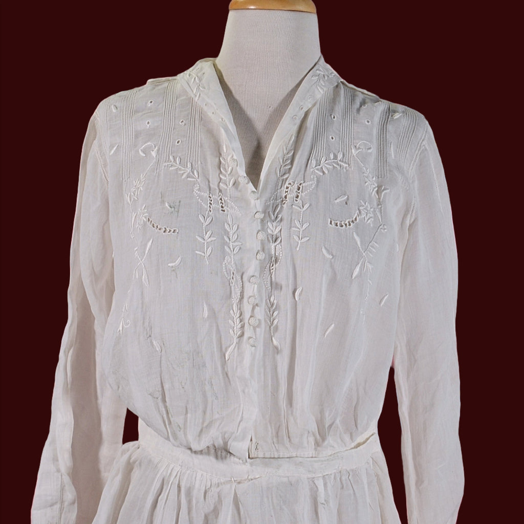 Antique Edwardian lawn dress, embroidery, and pintucks on the bodice.