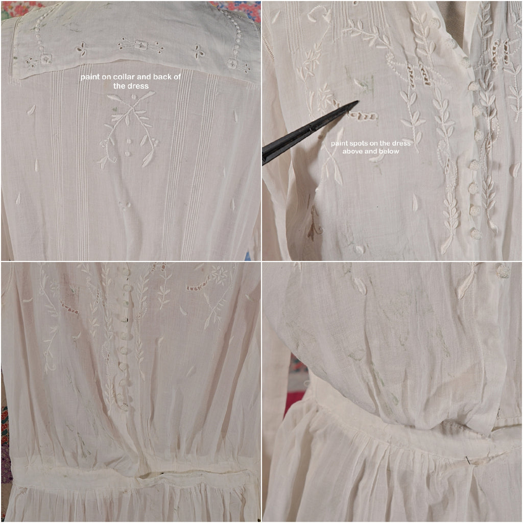 CONDITION: The dress is very wearable, with a few tiny holes. There are discolored stains that may be paint on the collar, bodice front and back, scattered places on the skirt. The dress has been hand-washed, but the stains remain. Good for costume, study, prop, display.