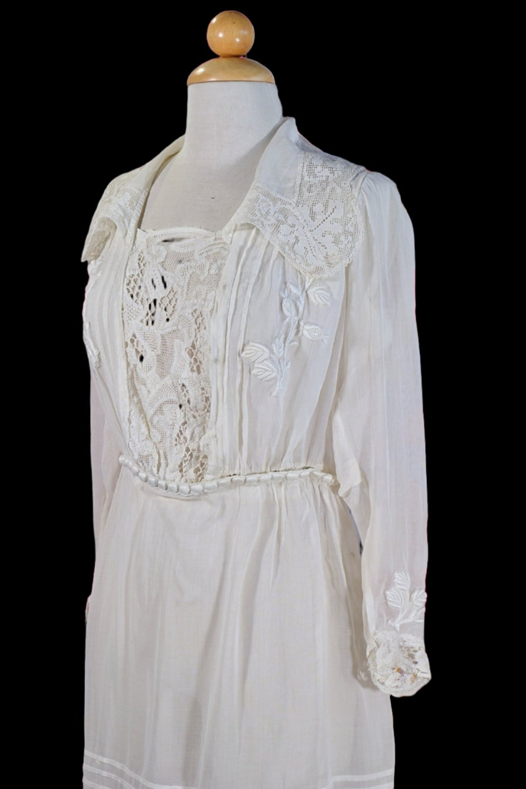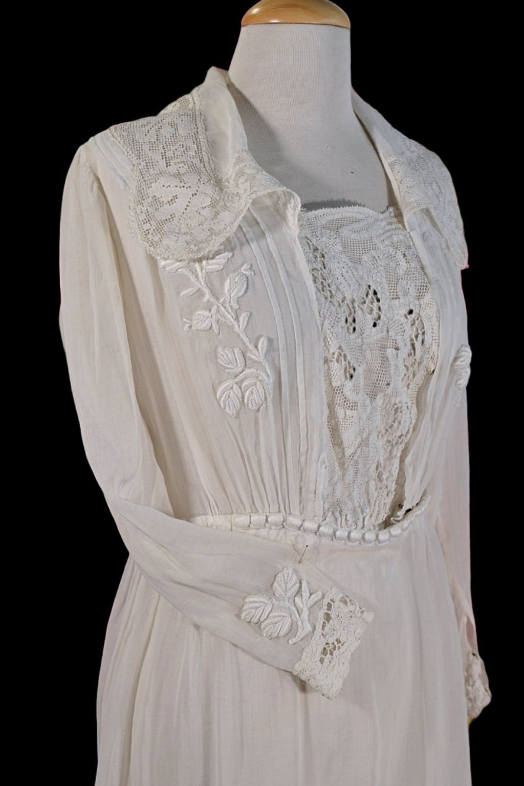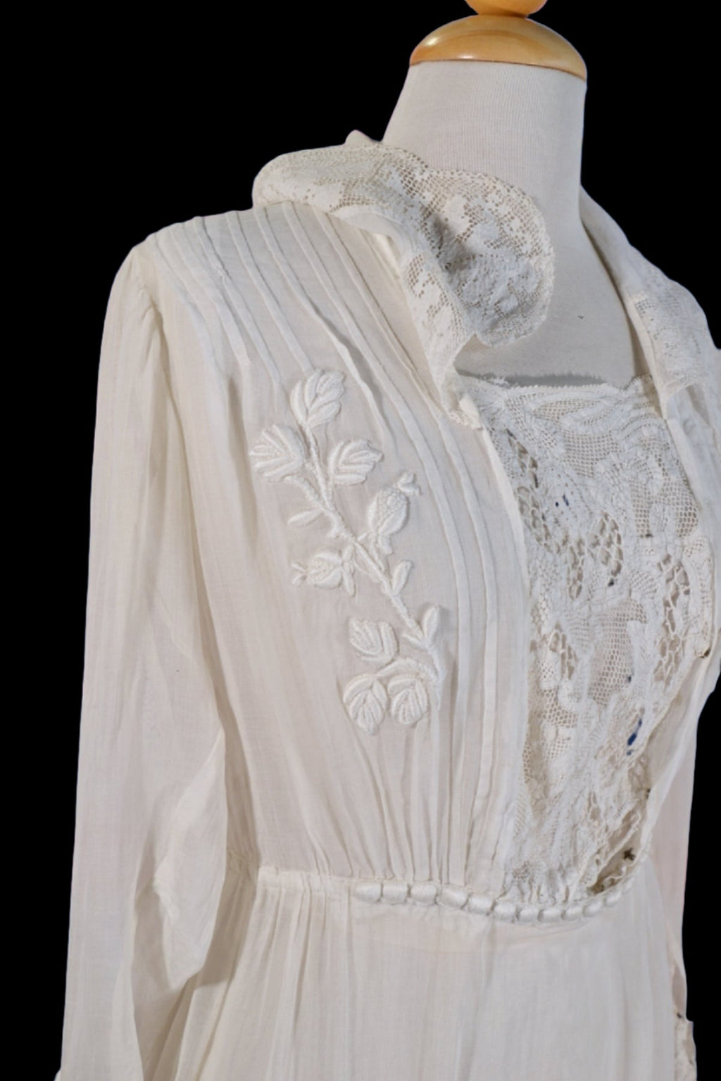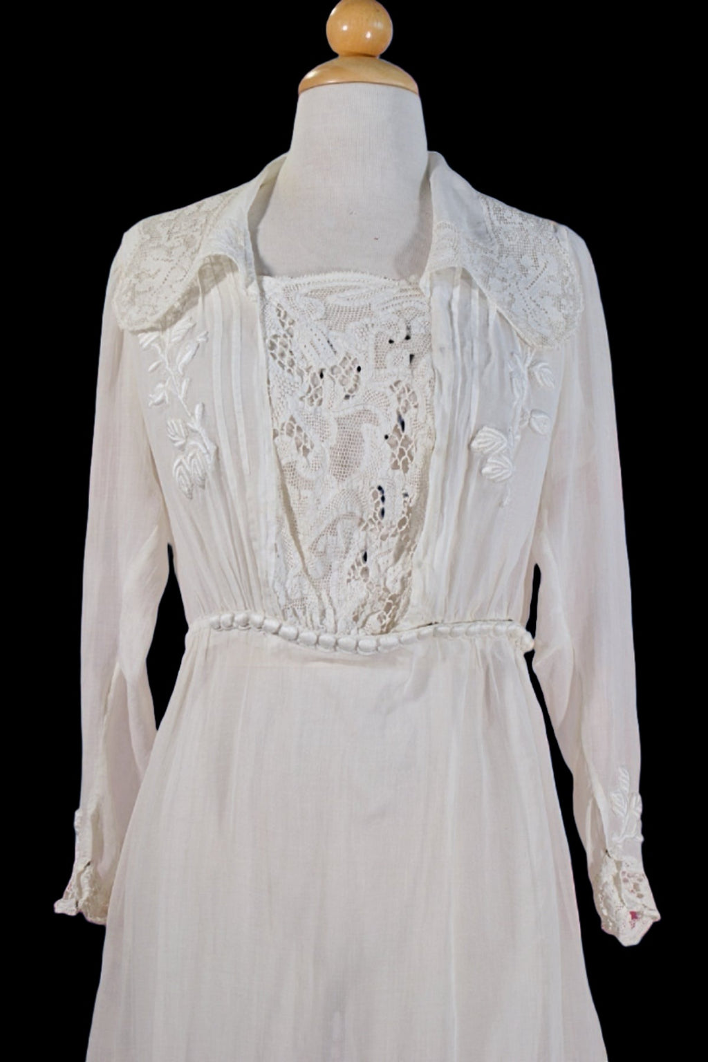 Antique Edwardian dress with embroidered details and lovely lace collar and inset bodice. The fabric is semi-sheer, the lace is sheer.