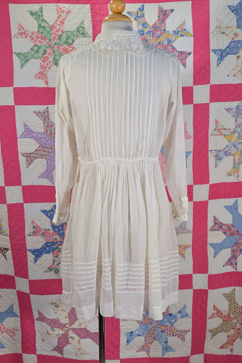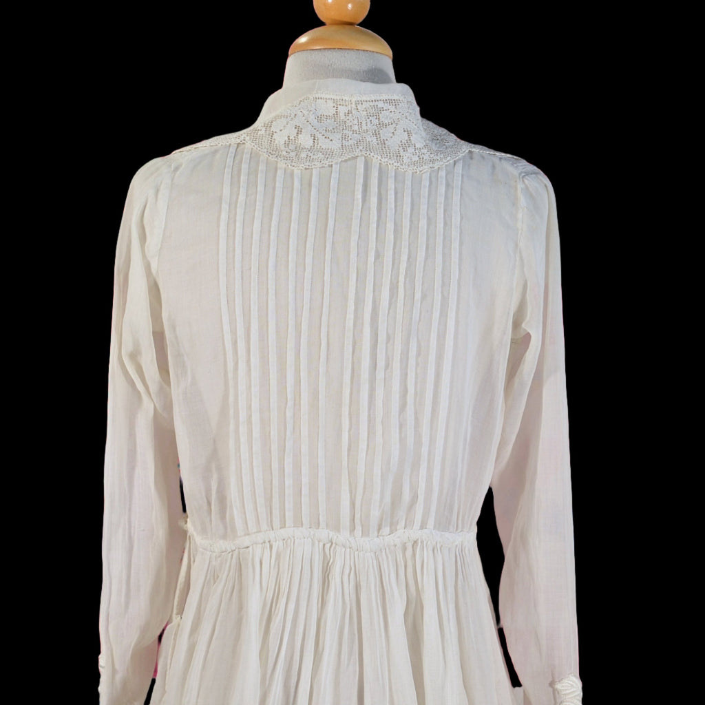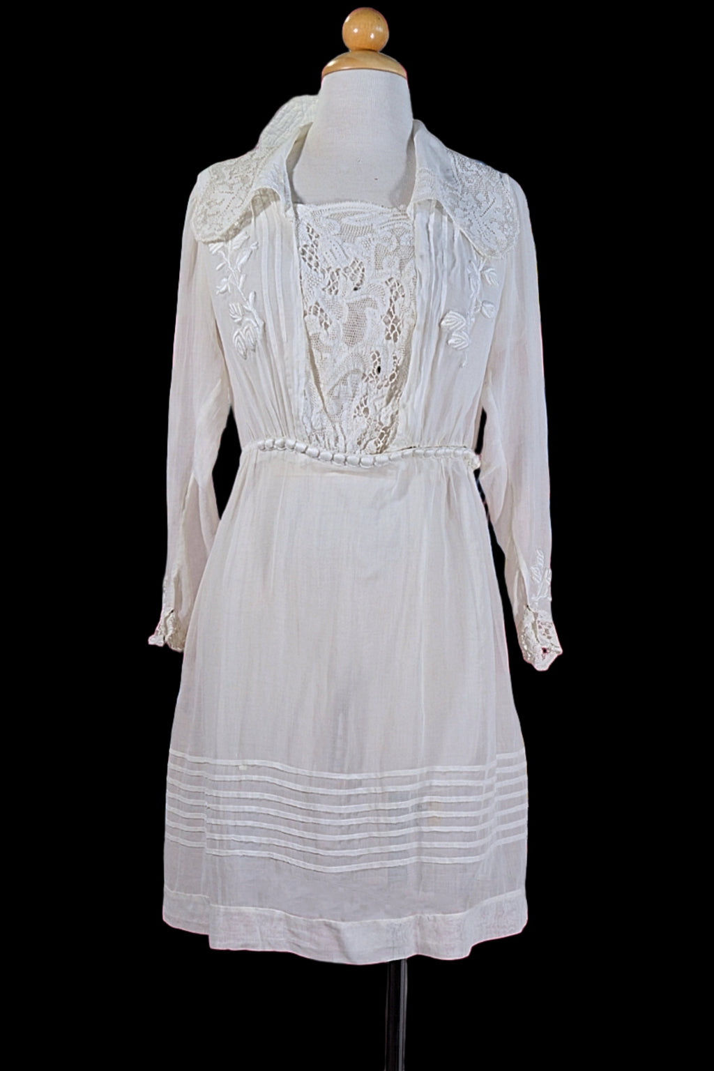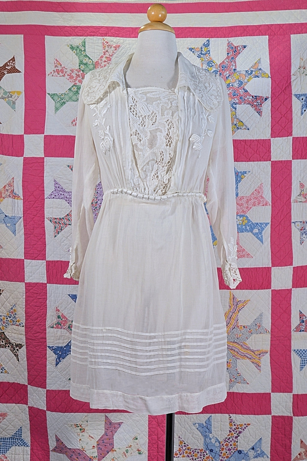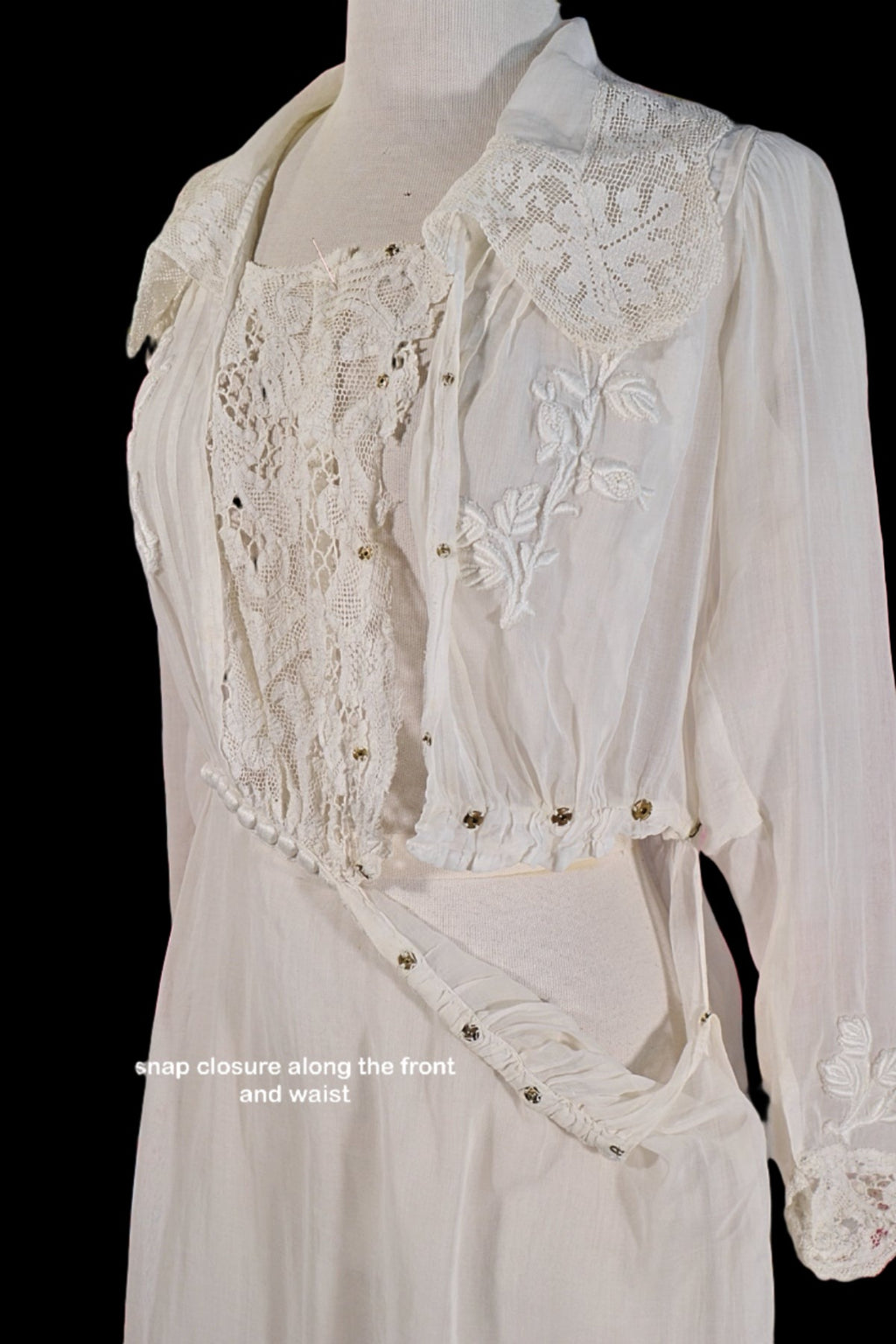 Antique Edwardian dress with embroidered details and lovely lace collar and inset bodice. The fabric is semi-sheer, the lace is sheer.