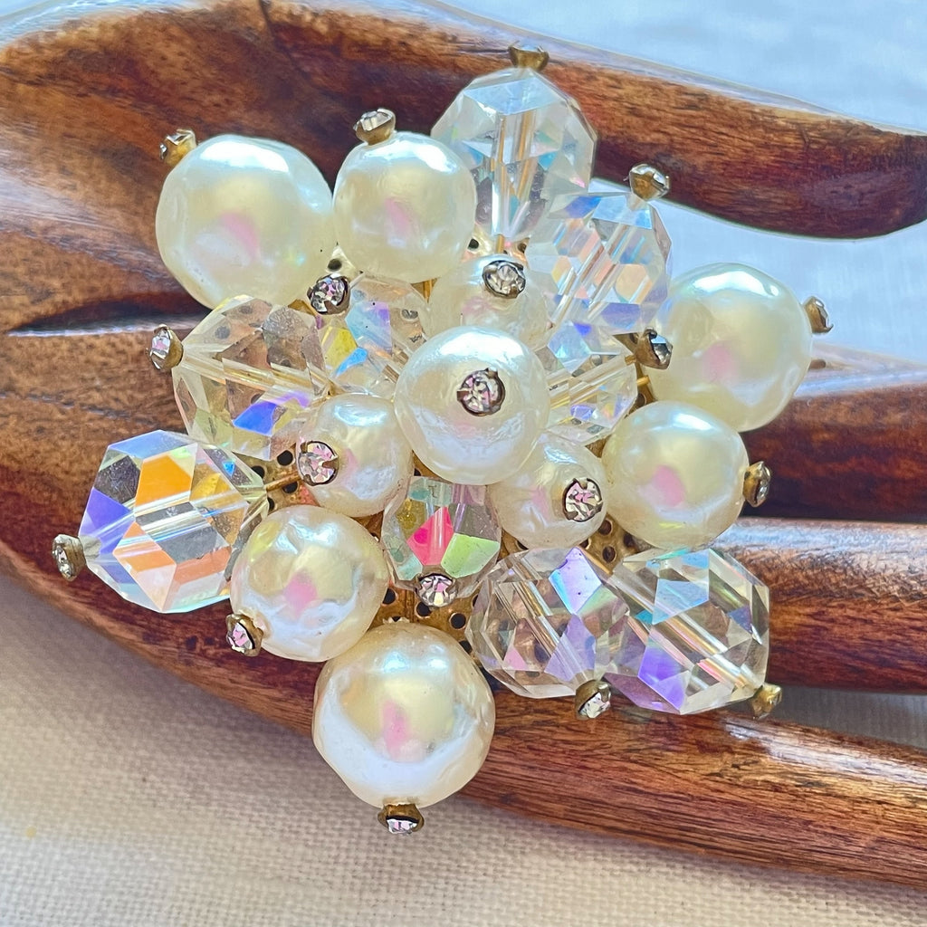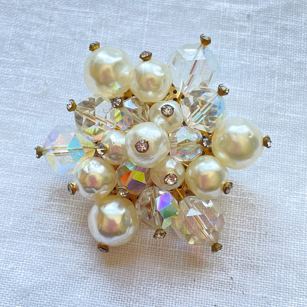 Vintage faux pearls, aurora borealis brooch with tiny rhinestone accents.