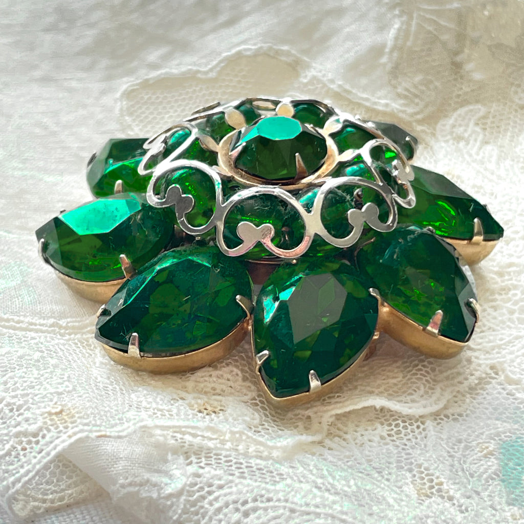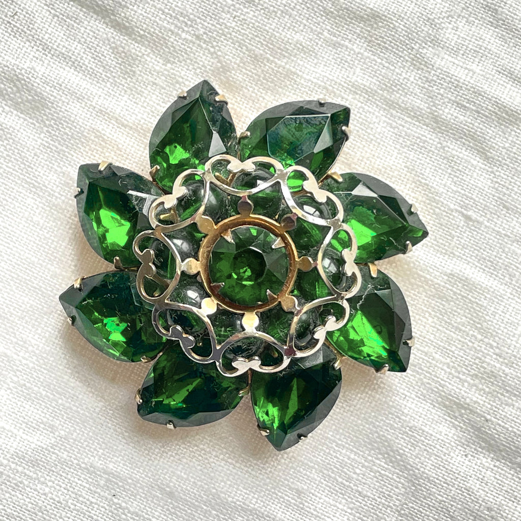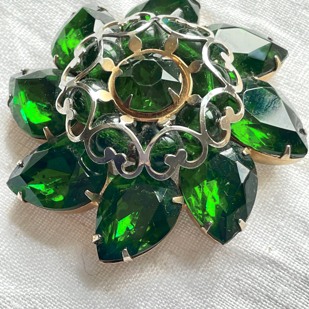 Mid Century domed emerald green pear shaped and round rhinestone brooch.