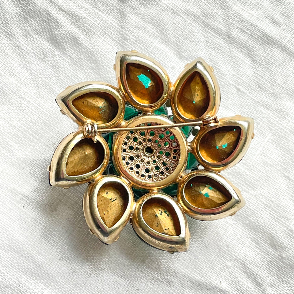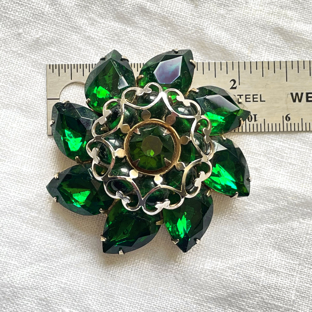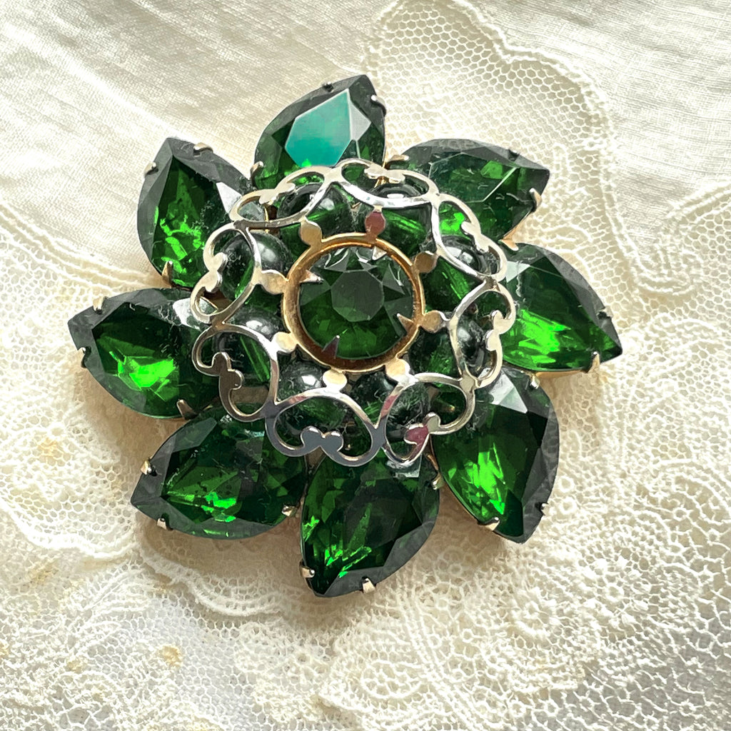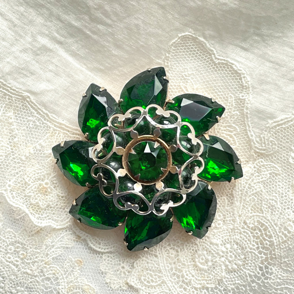 Mid Century domed emerald green pear shaped and round rhinestone brooch.
