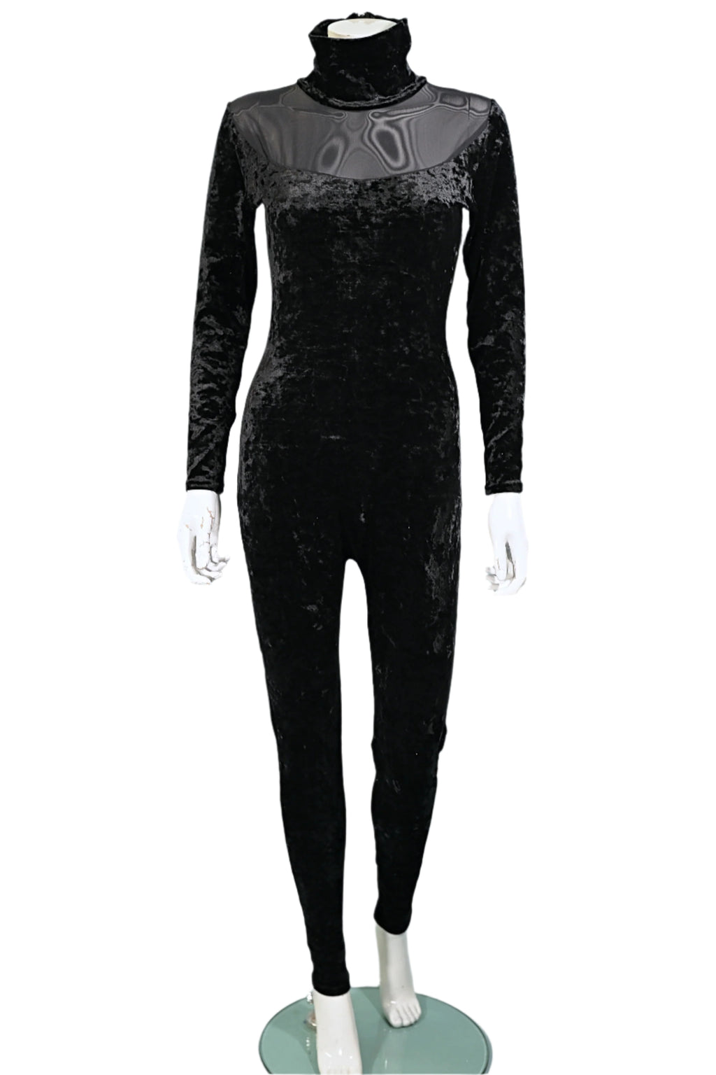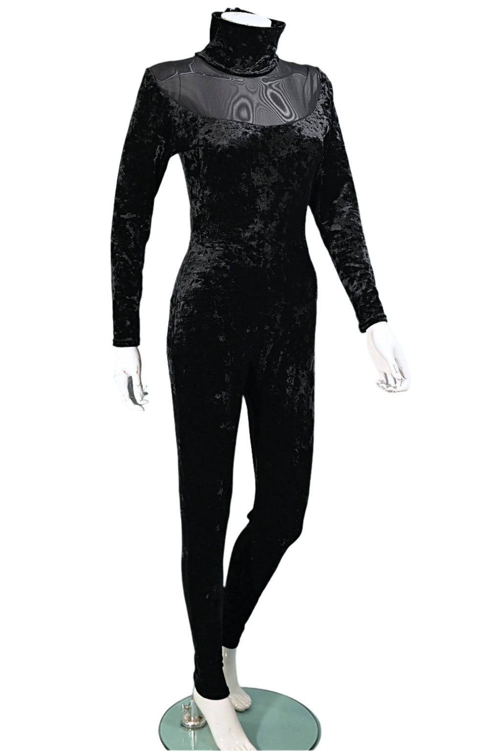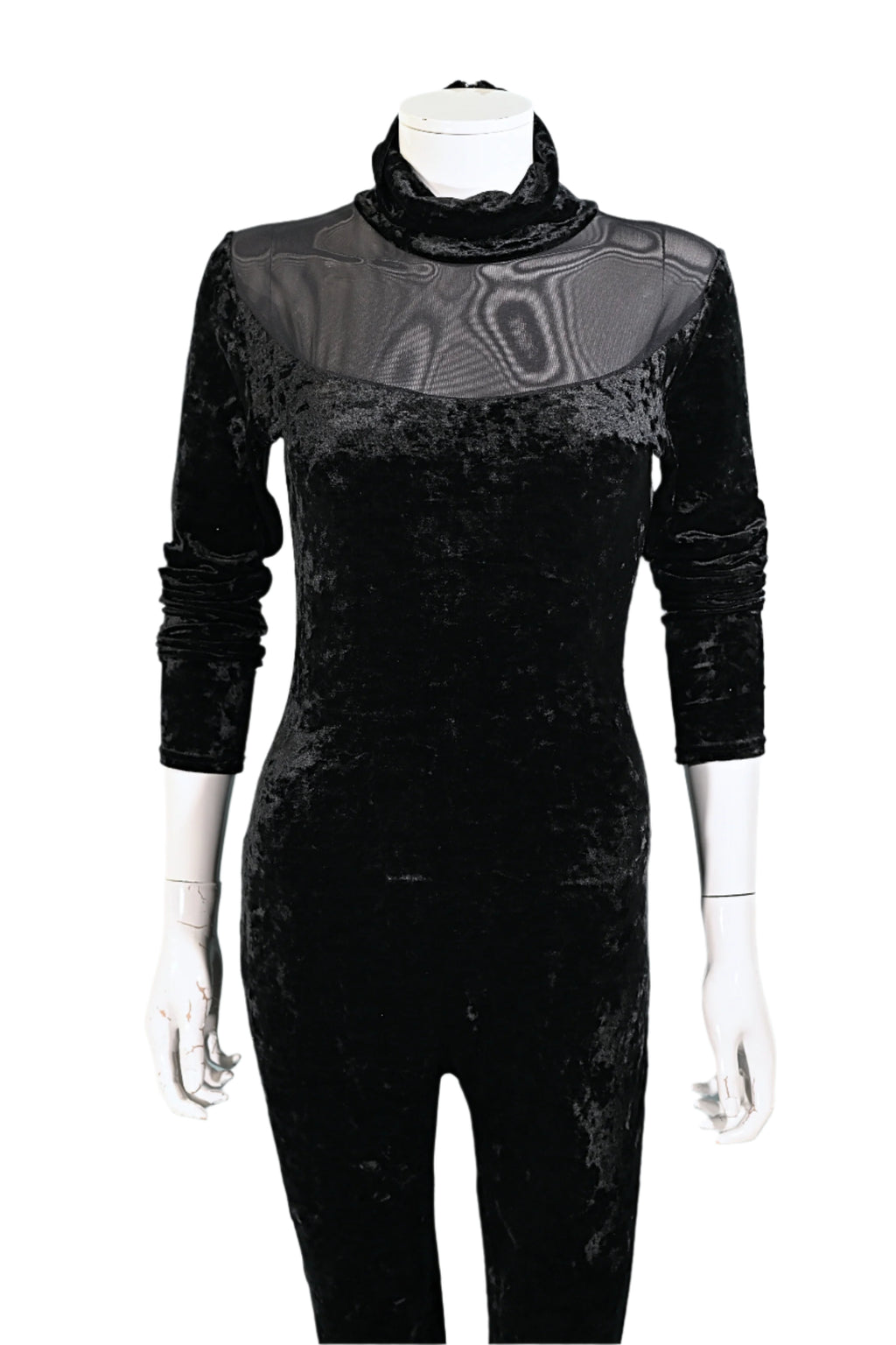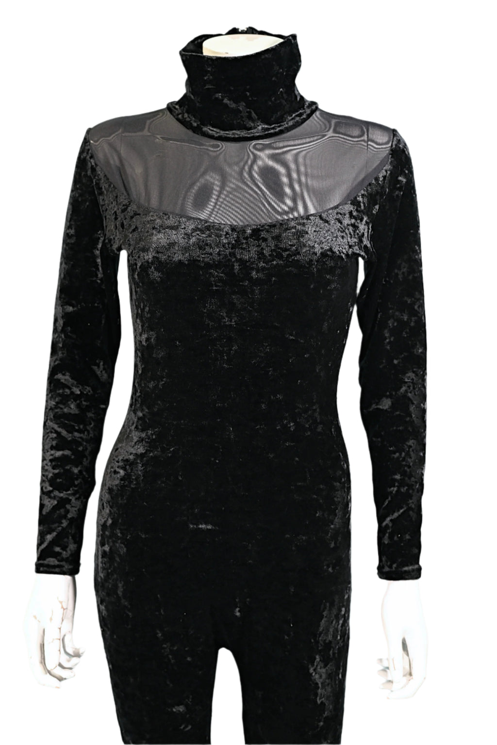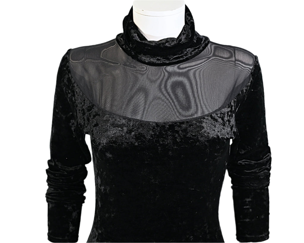 Stretchy black crushed velvet, mesh inset neckline, mock turtleneck.