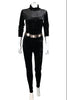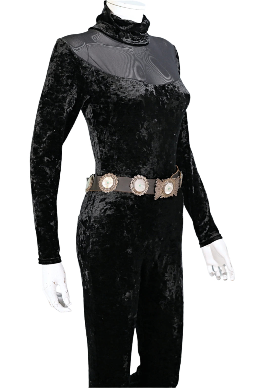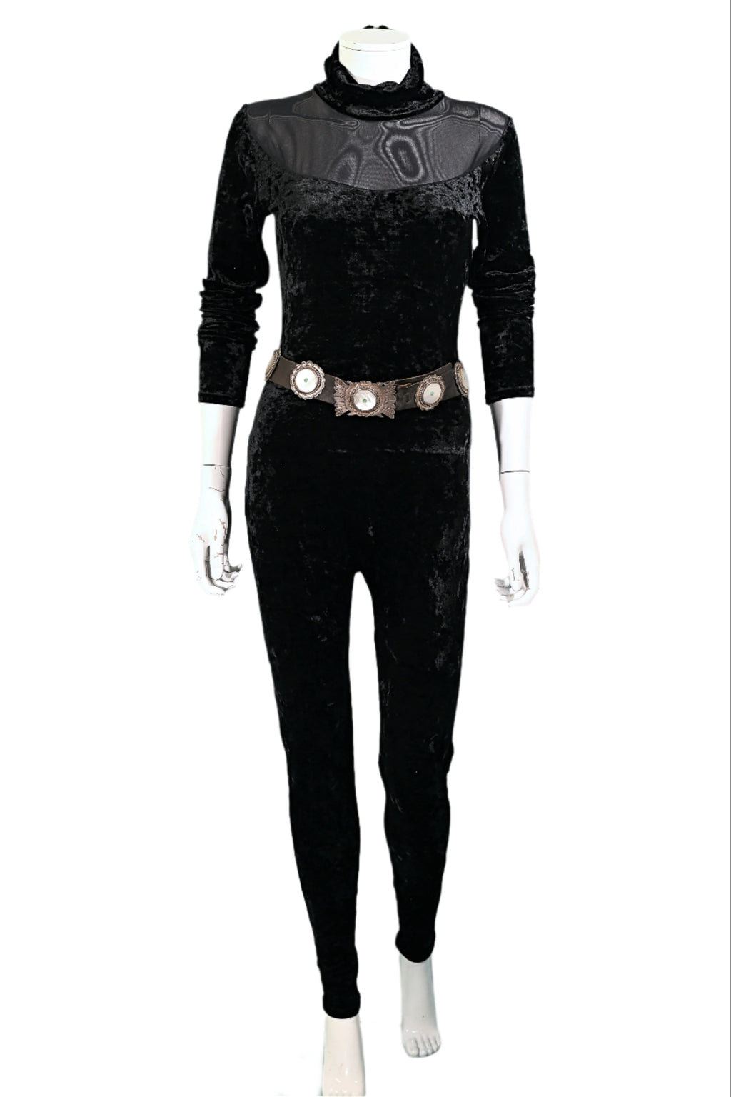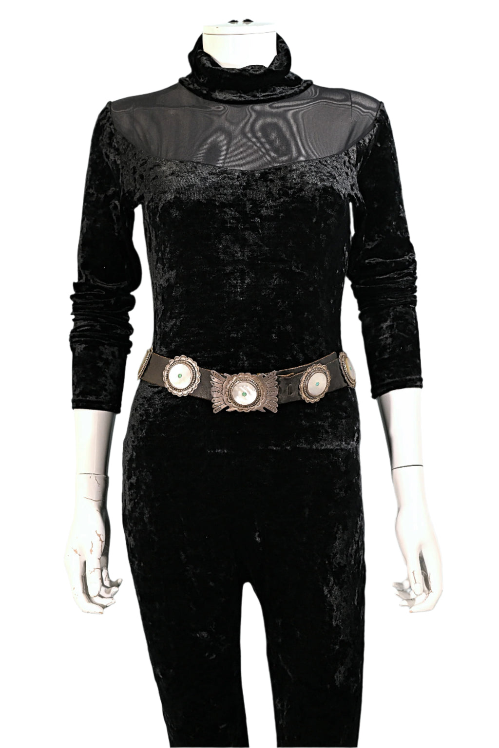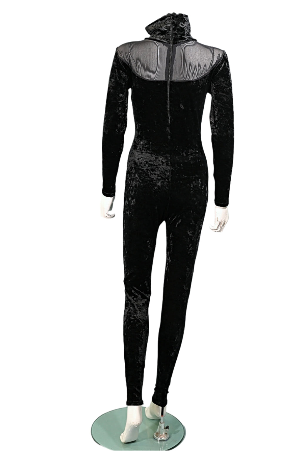 Stretchy black crushed velvet, mesh inset neckline, mock turtleneck.
