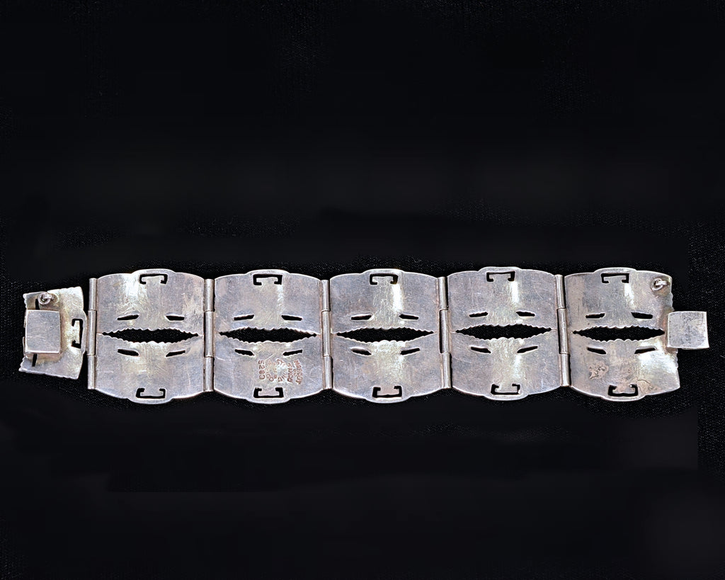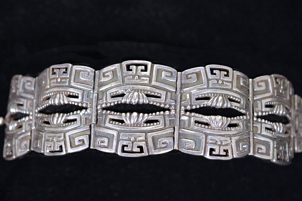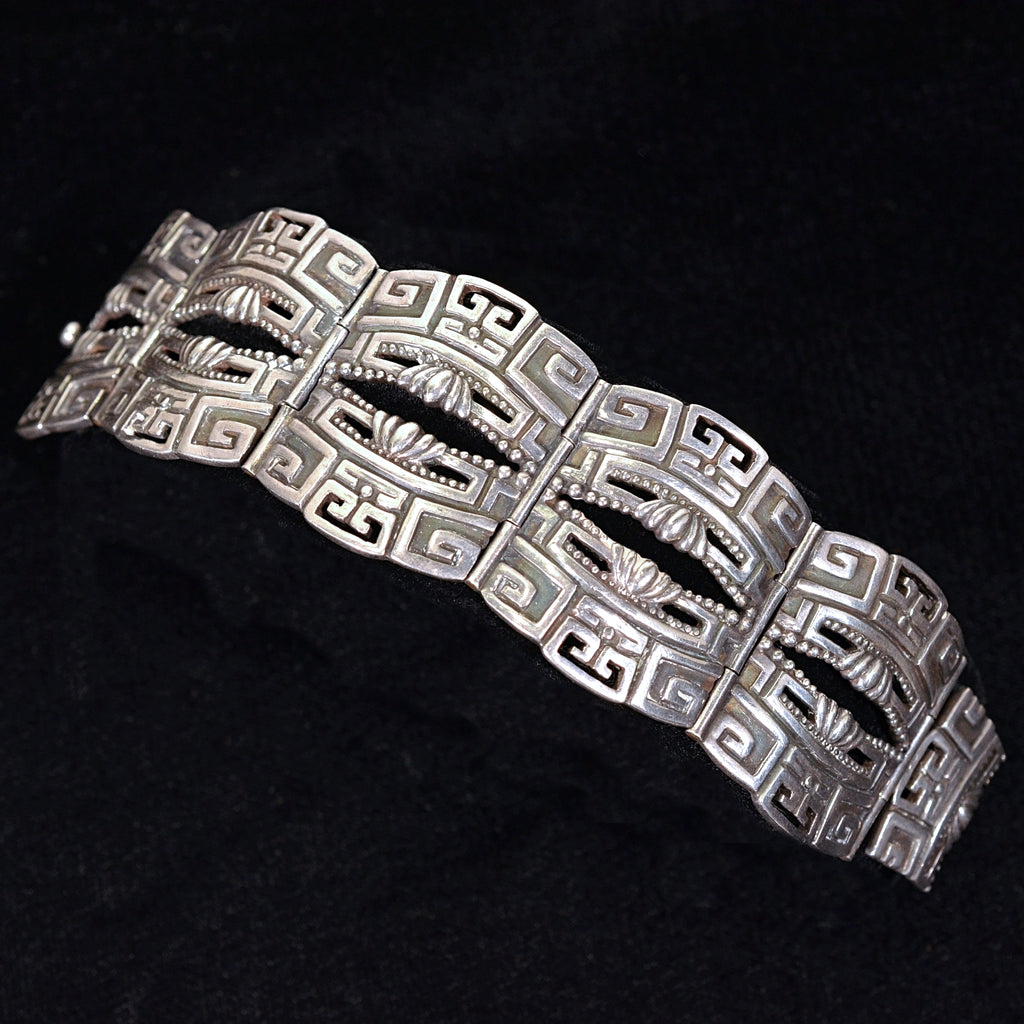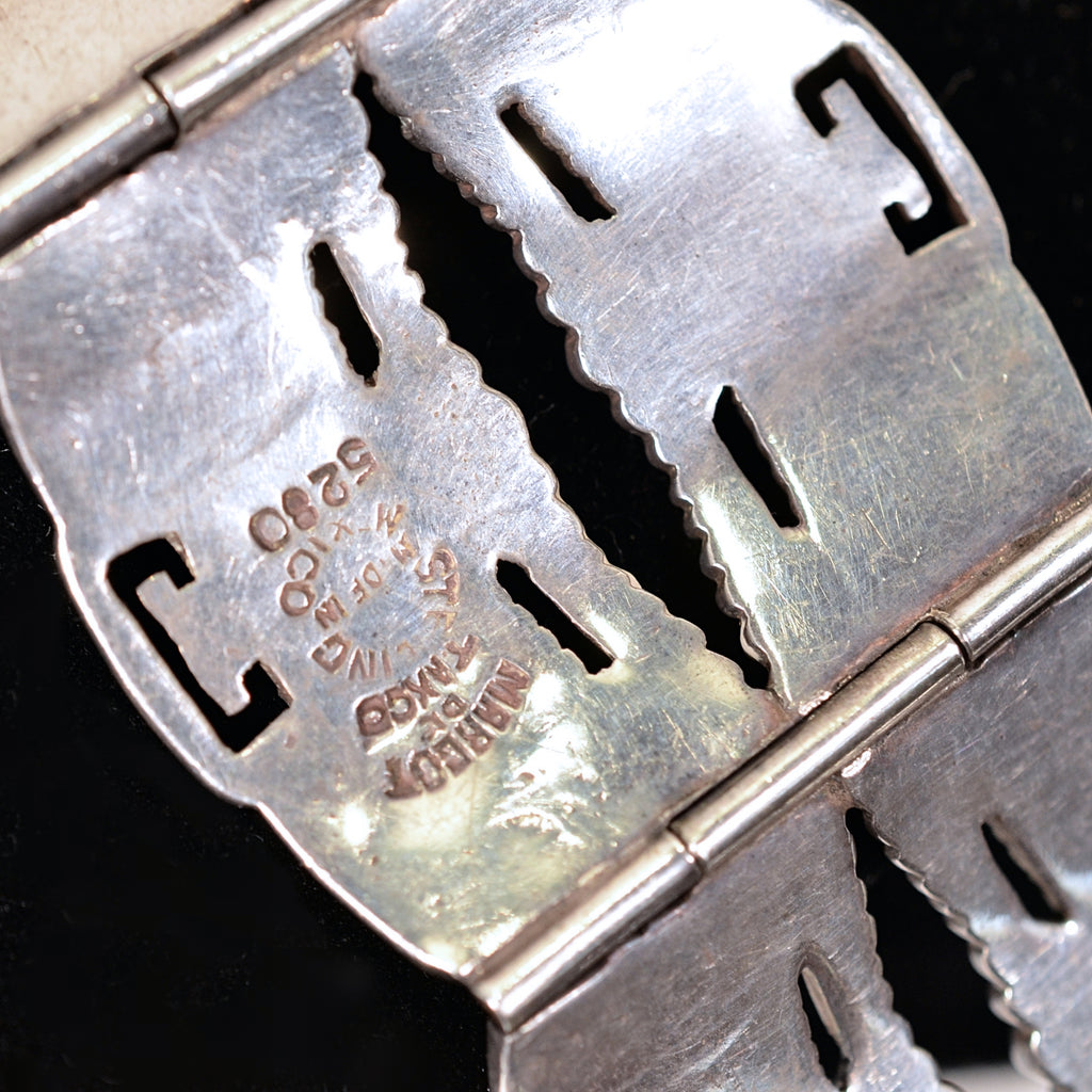 Beautiful Margot De Taxco sterling silver bracelet with intricate details.