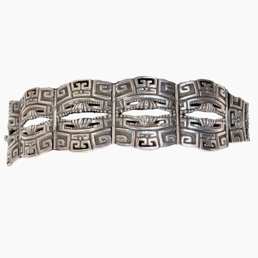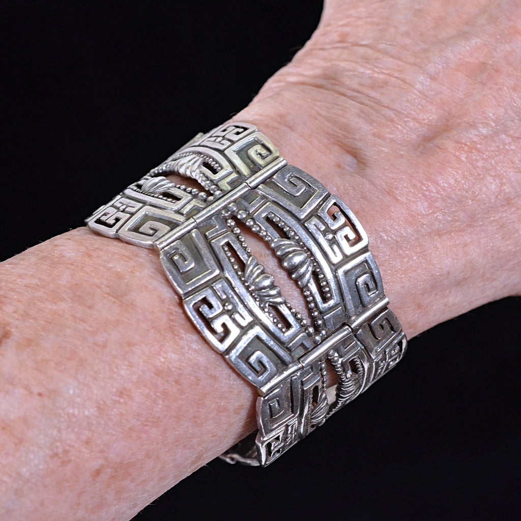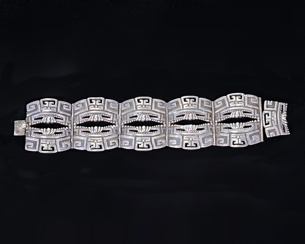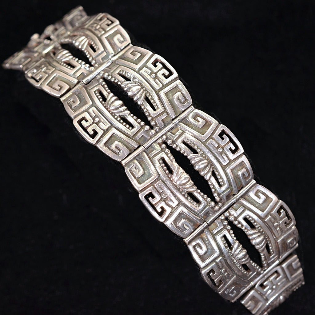 Beautiful Margot De Taxco sterling silver bracelet with intricate details.