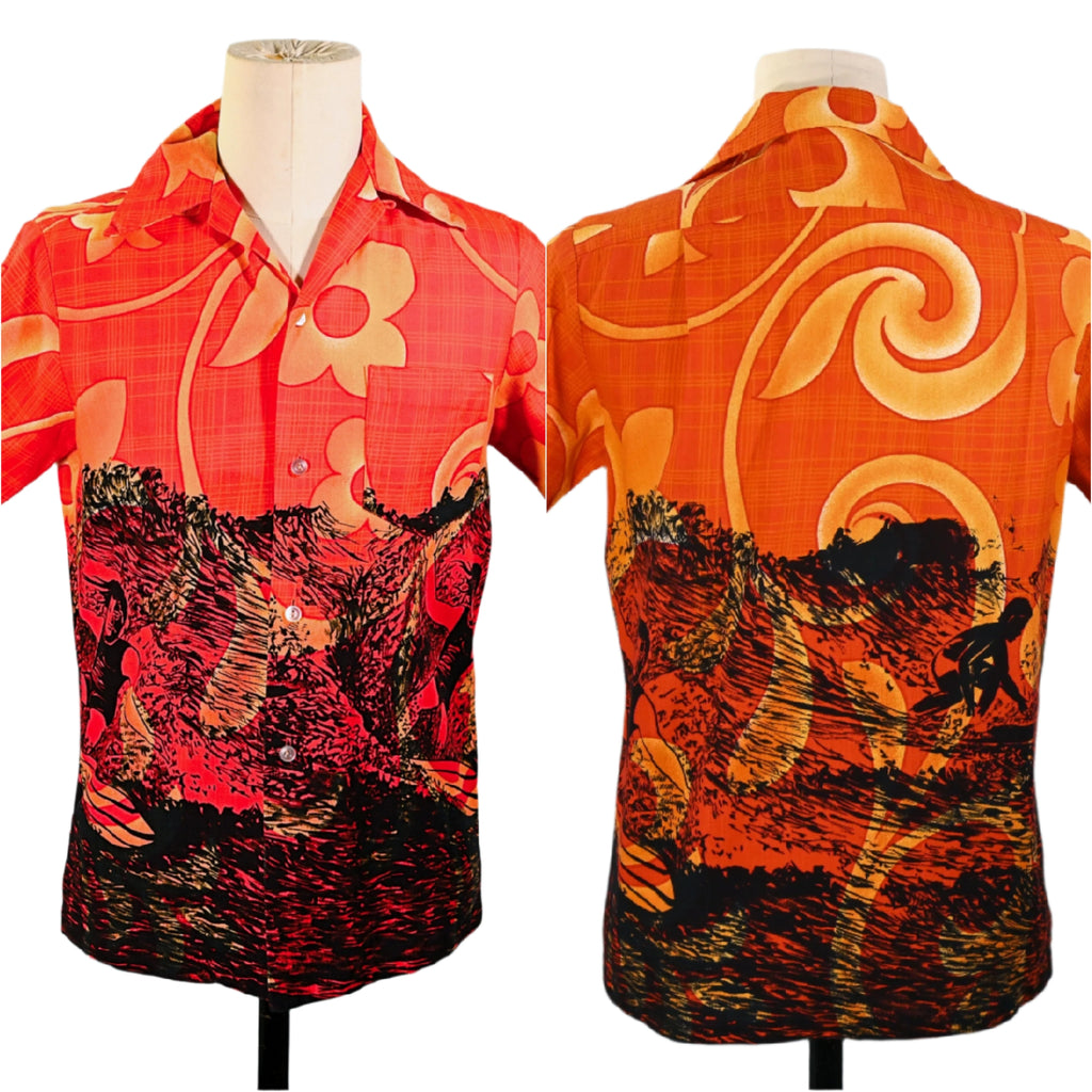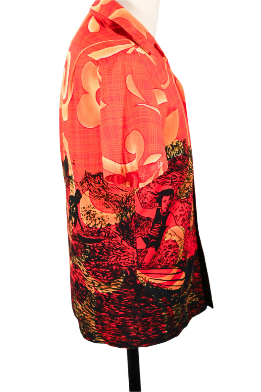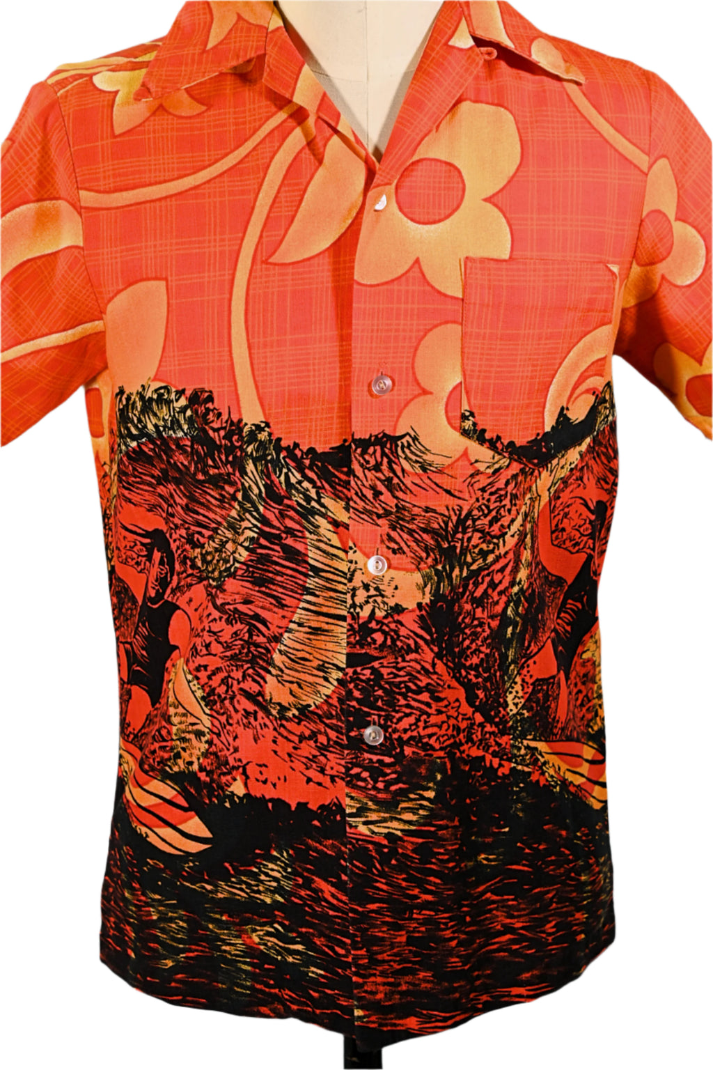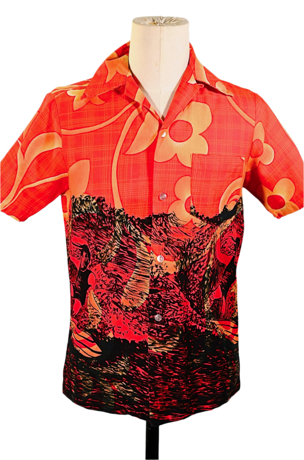 Great bold & vivid colored barkcloth Hawaiian shirt with flowers and surfers.