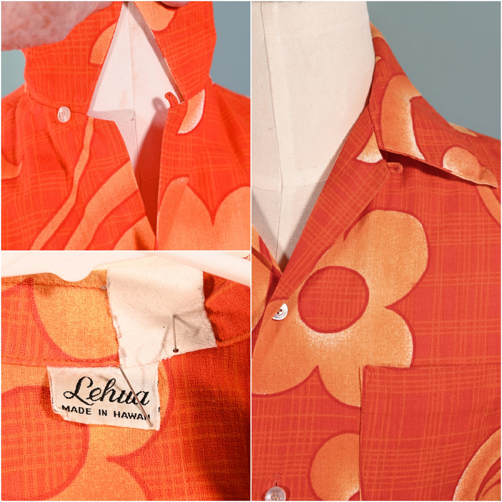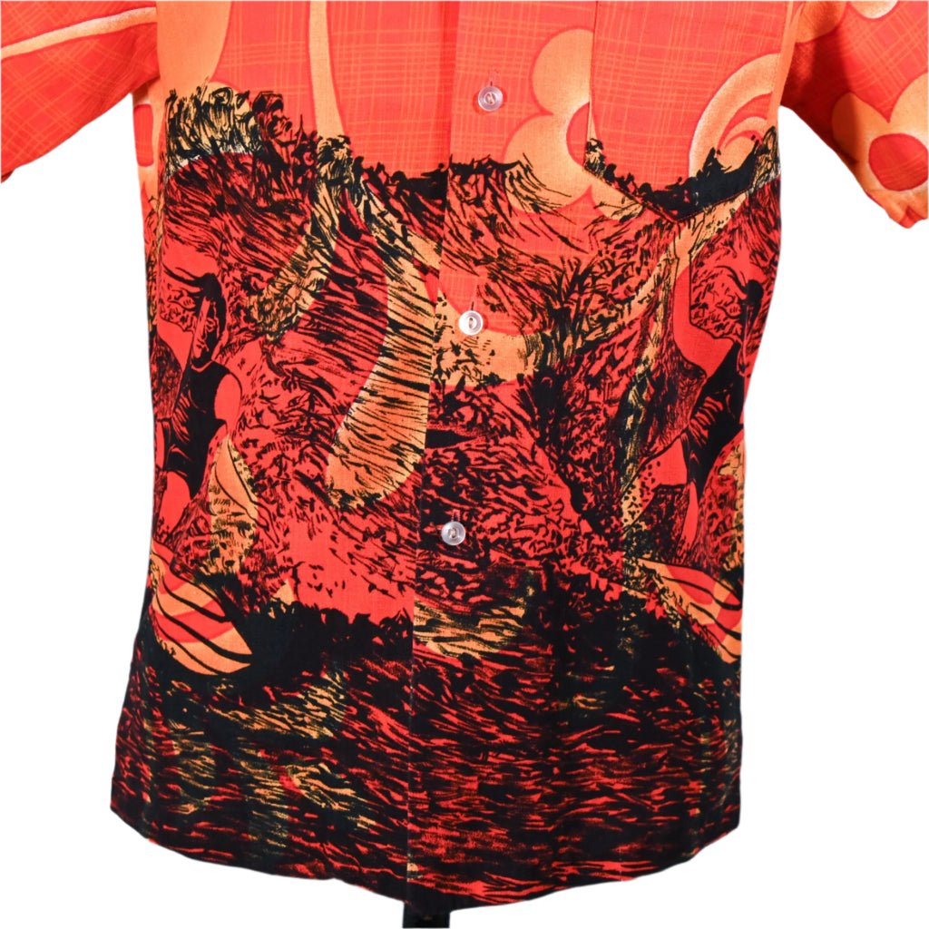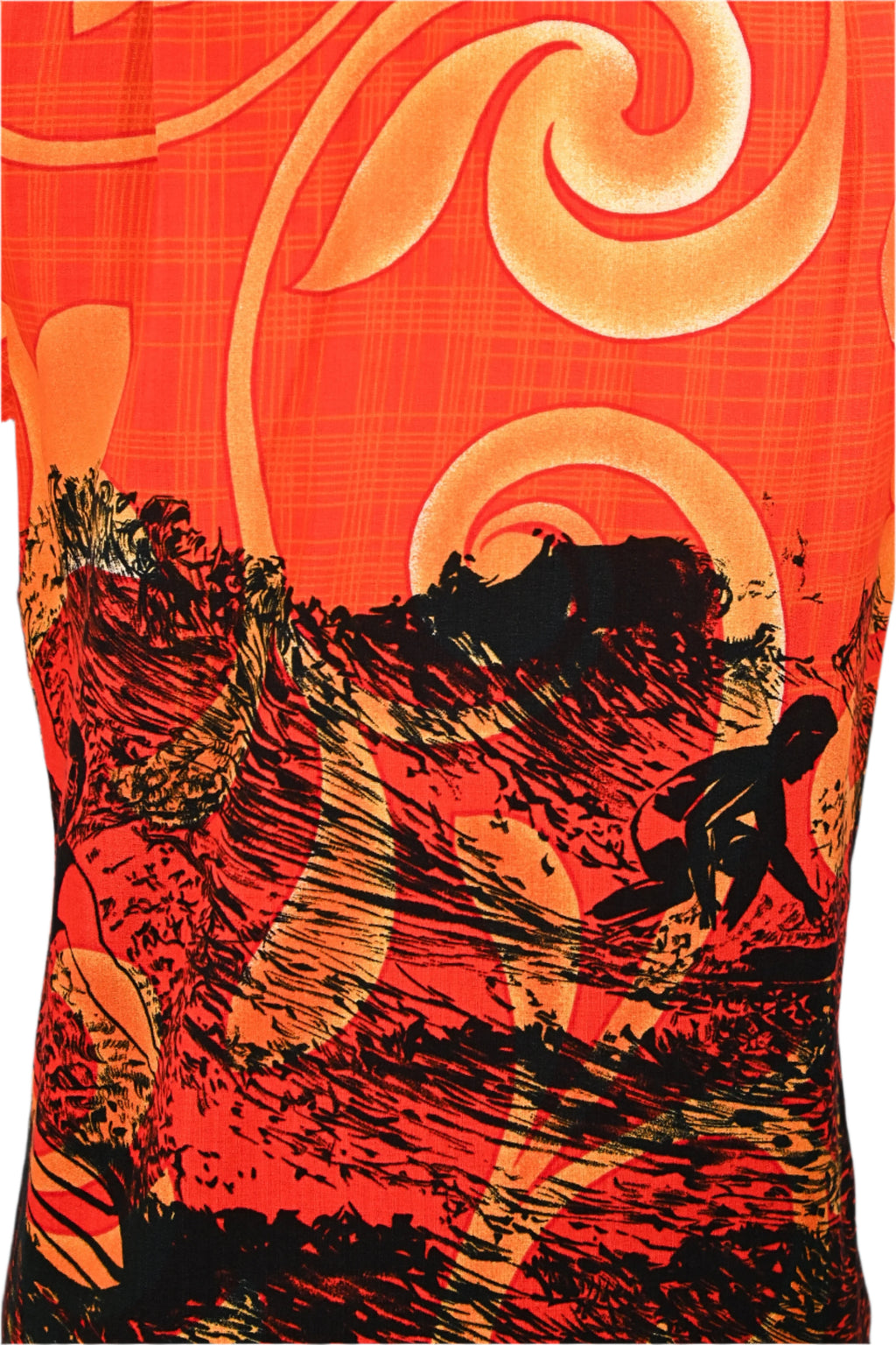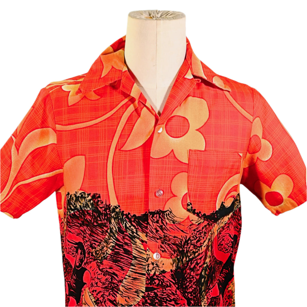 Great bold & vivid colored barkcloth Hawaiian shirt with flowers and surfers.