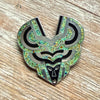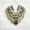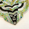 It is a Mayan-style face surrounded by swirls. The piece is from the Mask series.