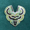 Champlevé enamel is created with indented areas that are carved or cast into the metal and then filled with the enamel. After the enamel has been fired, the object is then filed and polished, leaving the non-indented areas without enamel. The name Champlevé comes from the French word meaning ‘raised field’.