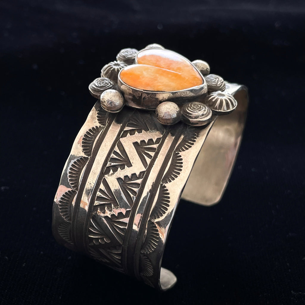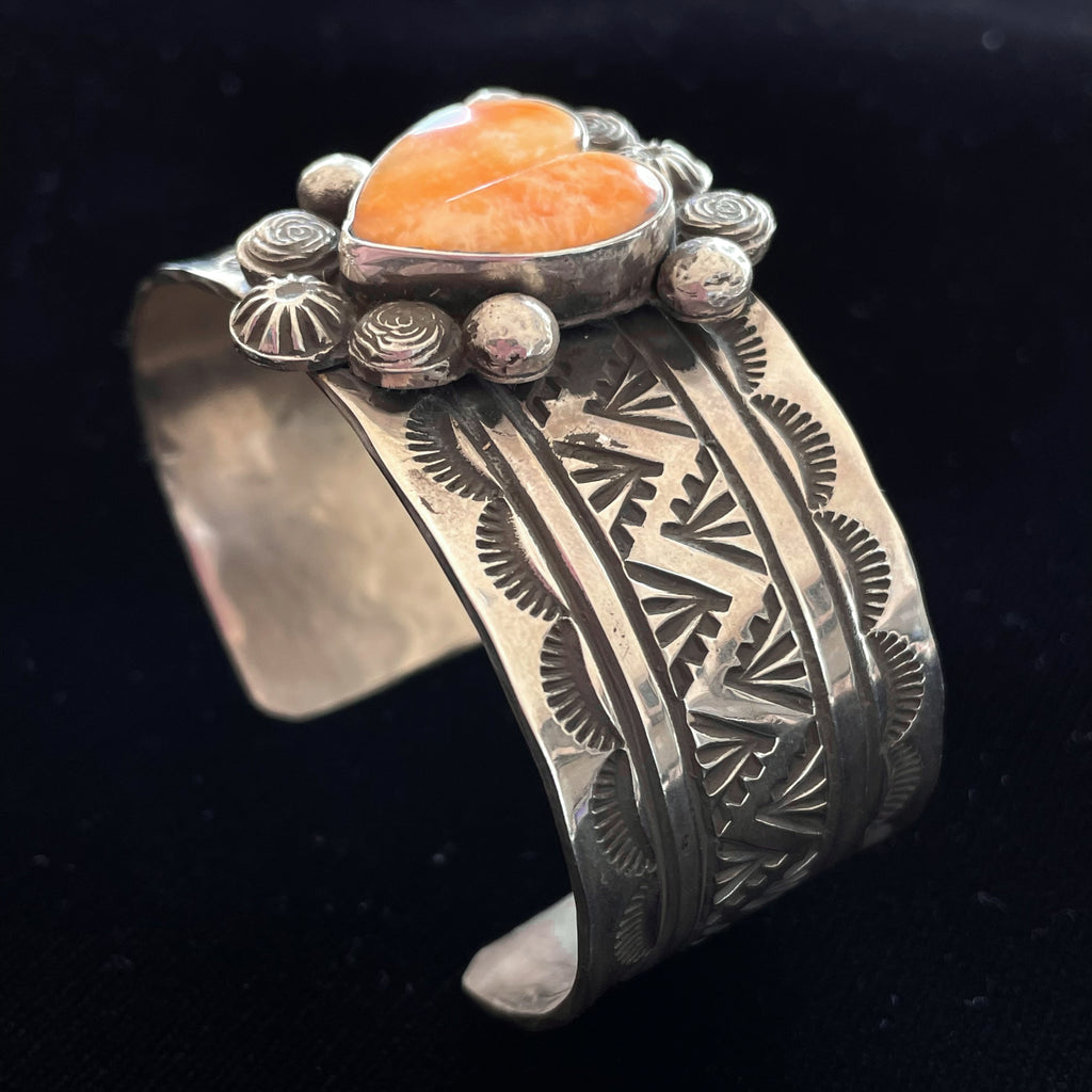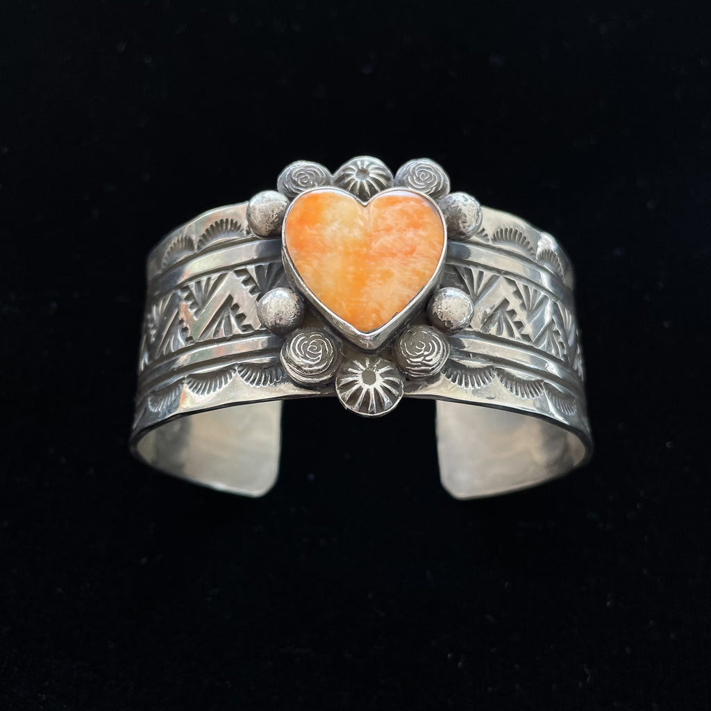 Orange spiny oyster heart shaped stone in the center, bezel set.