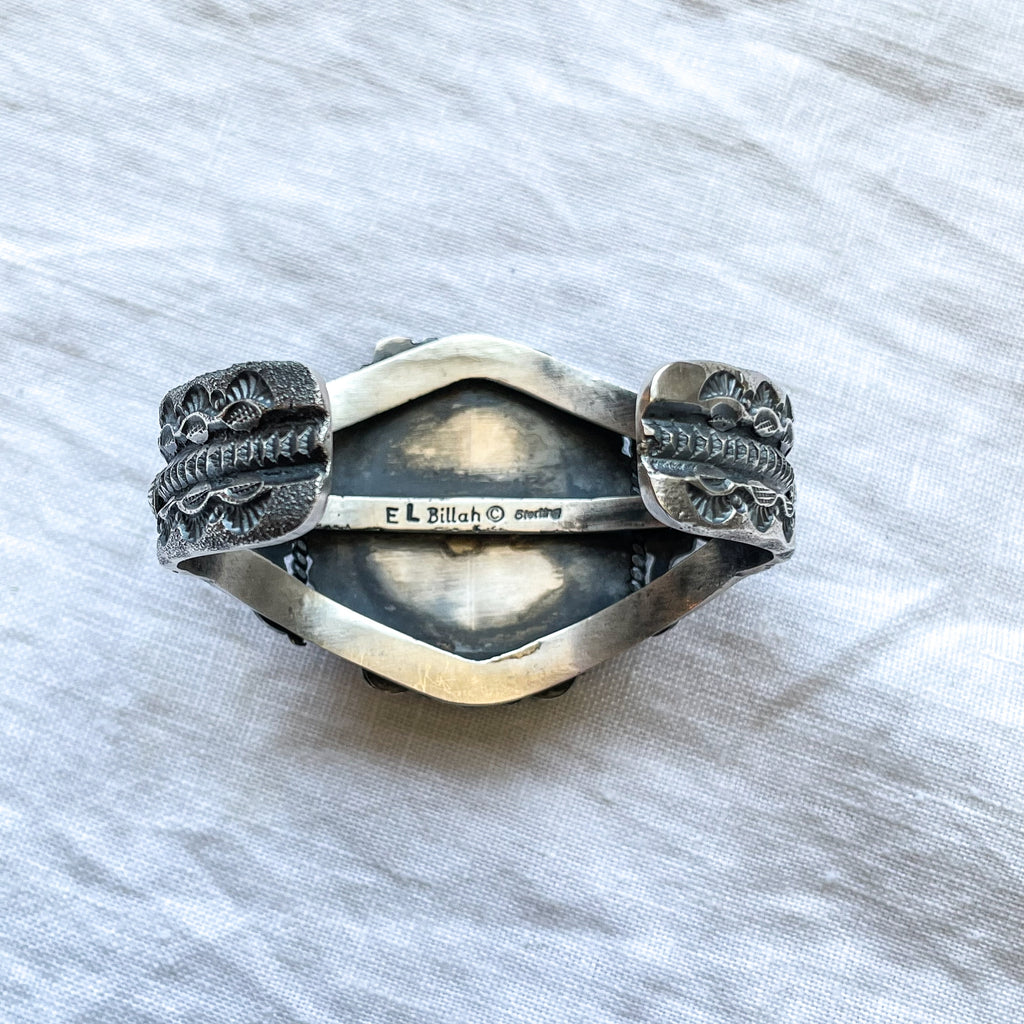 E L Billah Sterling silver cuff bracelet, Tufa cast with intricate detailing.