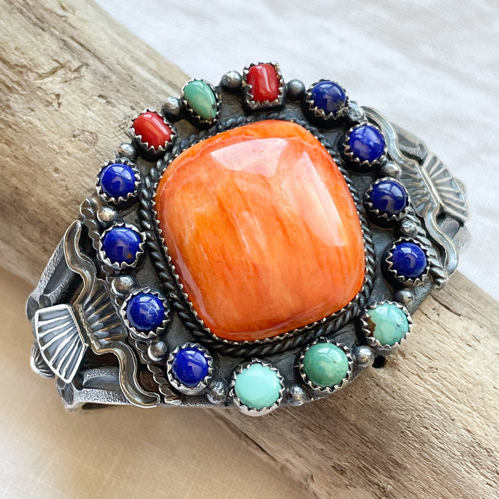Spiny oyster center stone, turquoise, lapis, coral smaller stones.