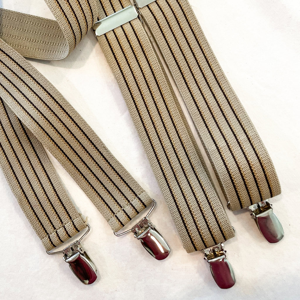 Vintage striped suspenders, tan with dark brown stripe. Silver tone metal clips.