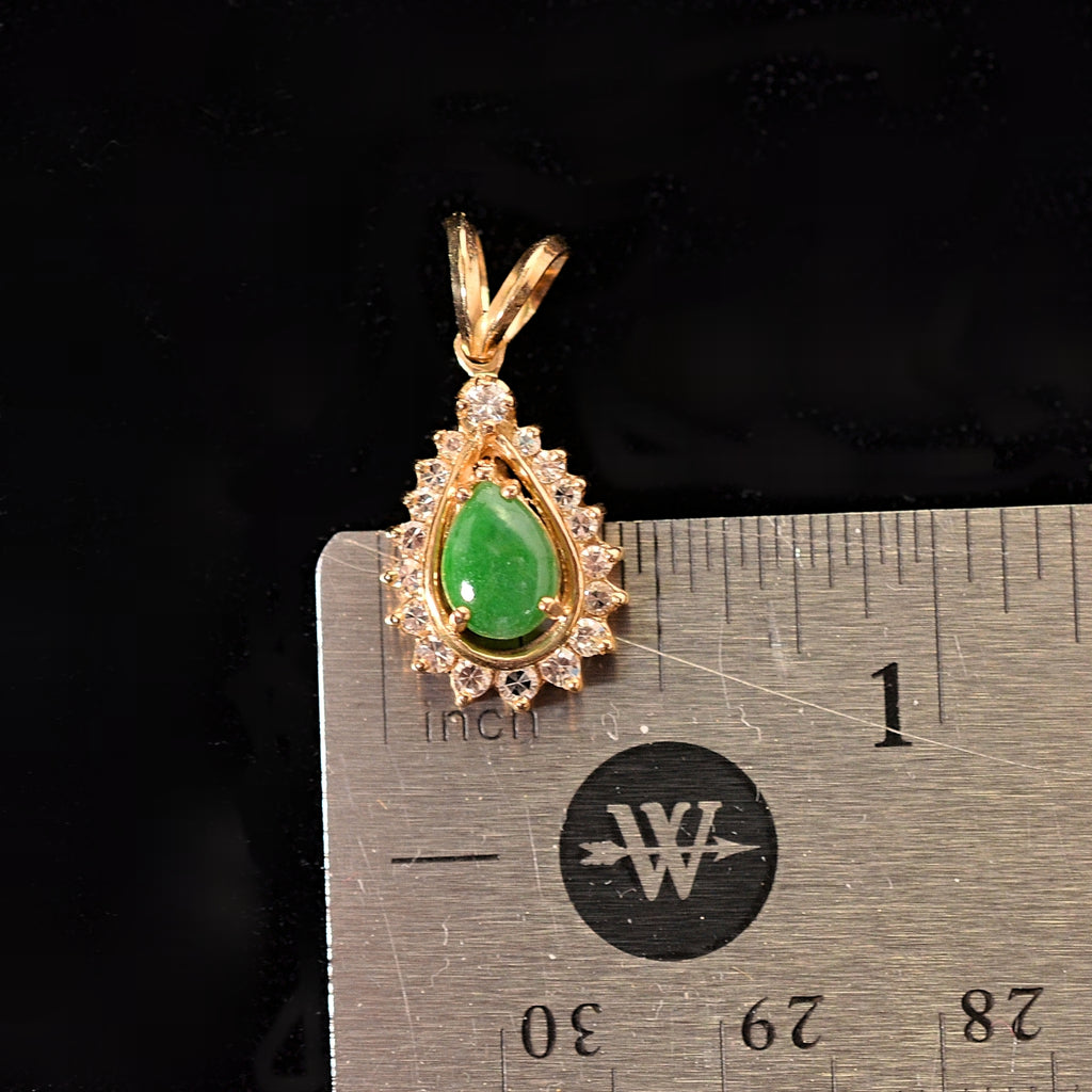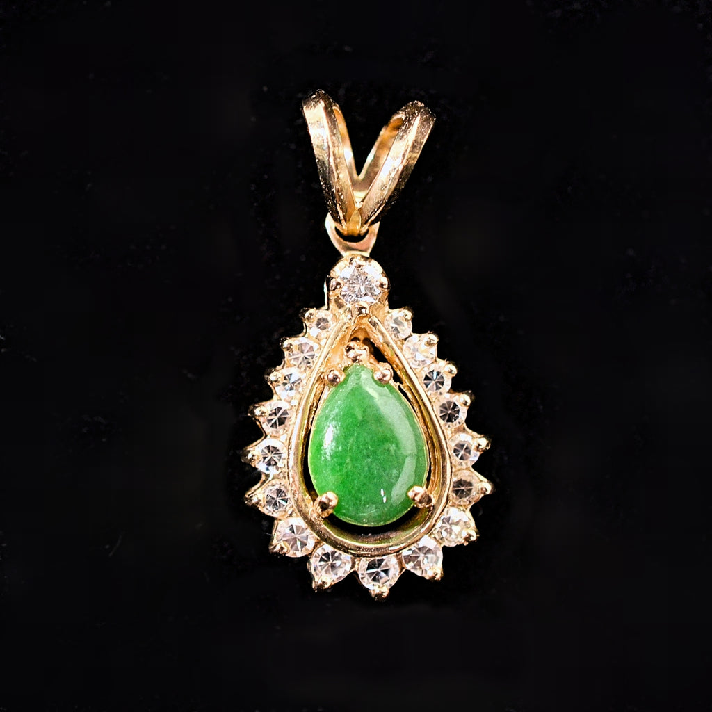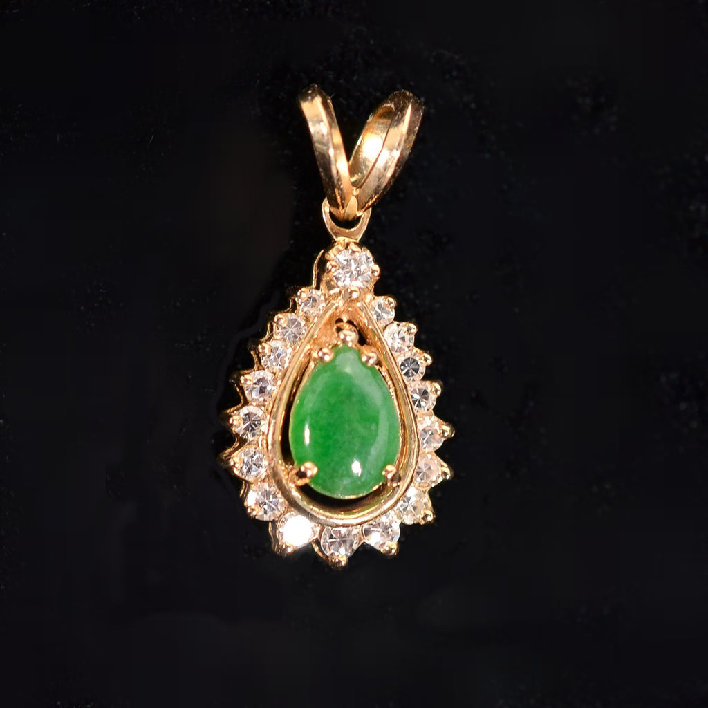 Small green pear-shaped Jadeite, surrounded by small diamonds, set in 14K gold.