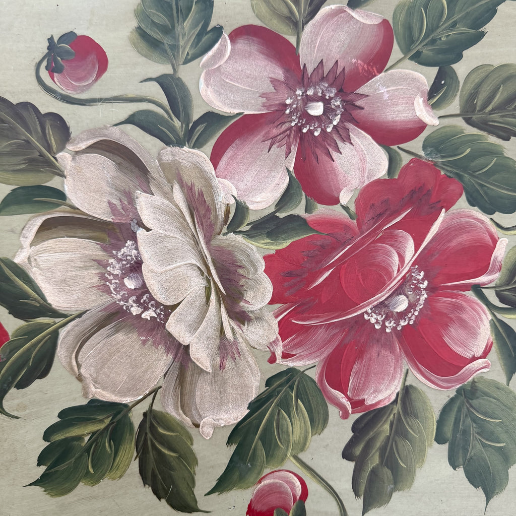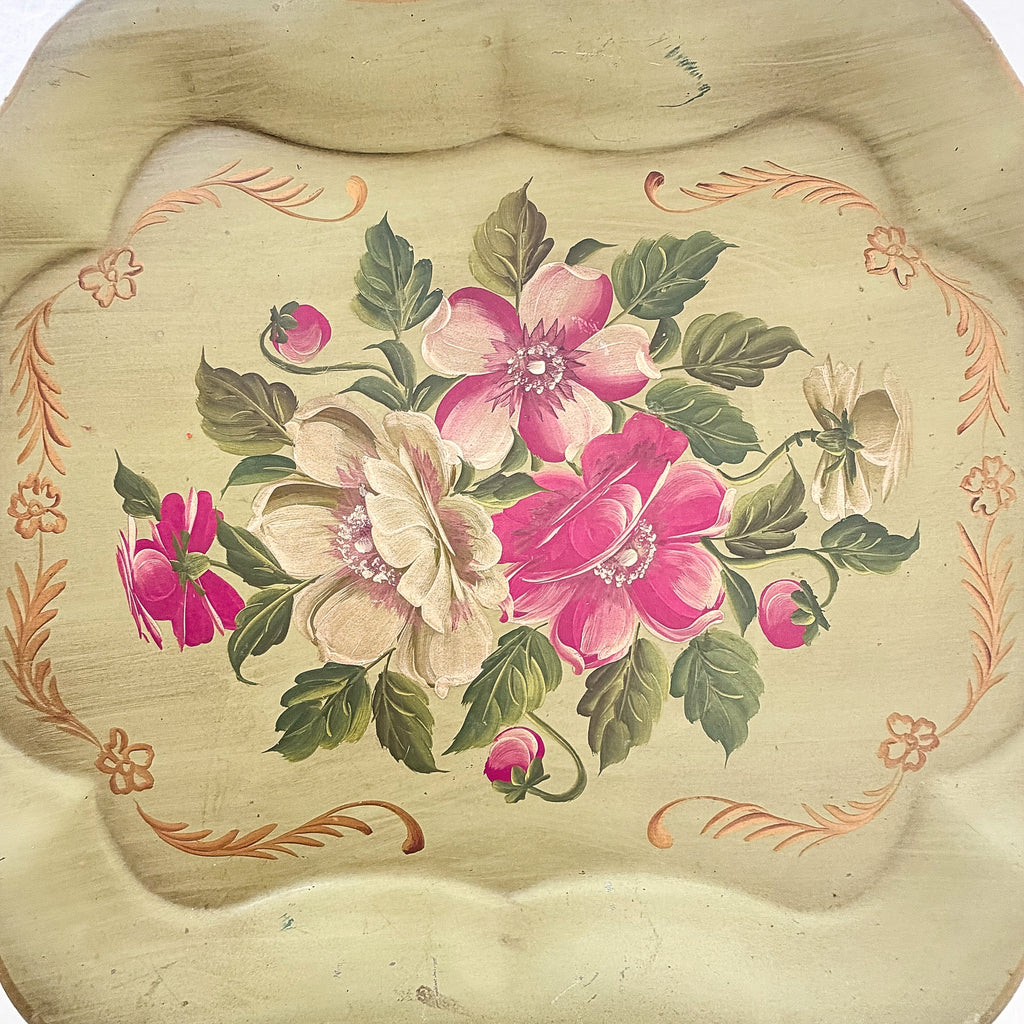 Celery/sage green tray accented with gold details and full lovely flowers in pink, maroon and taupe. Antiqued brushed finish. *It was difficult to show the accurate color in photos.