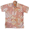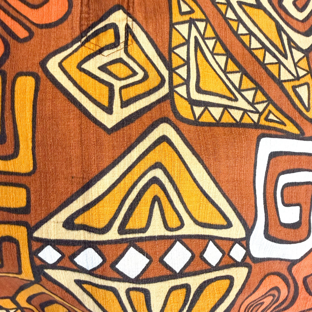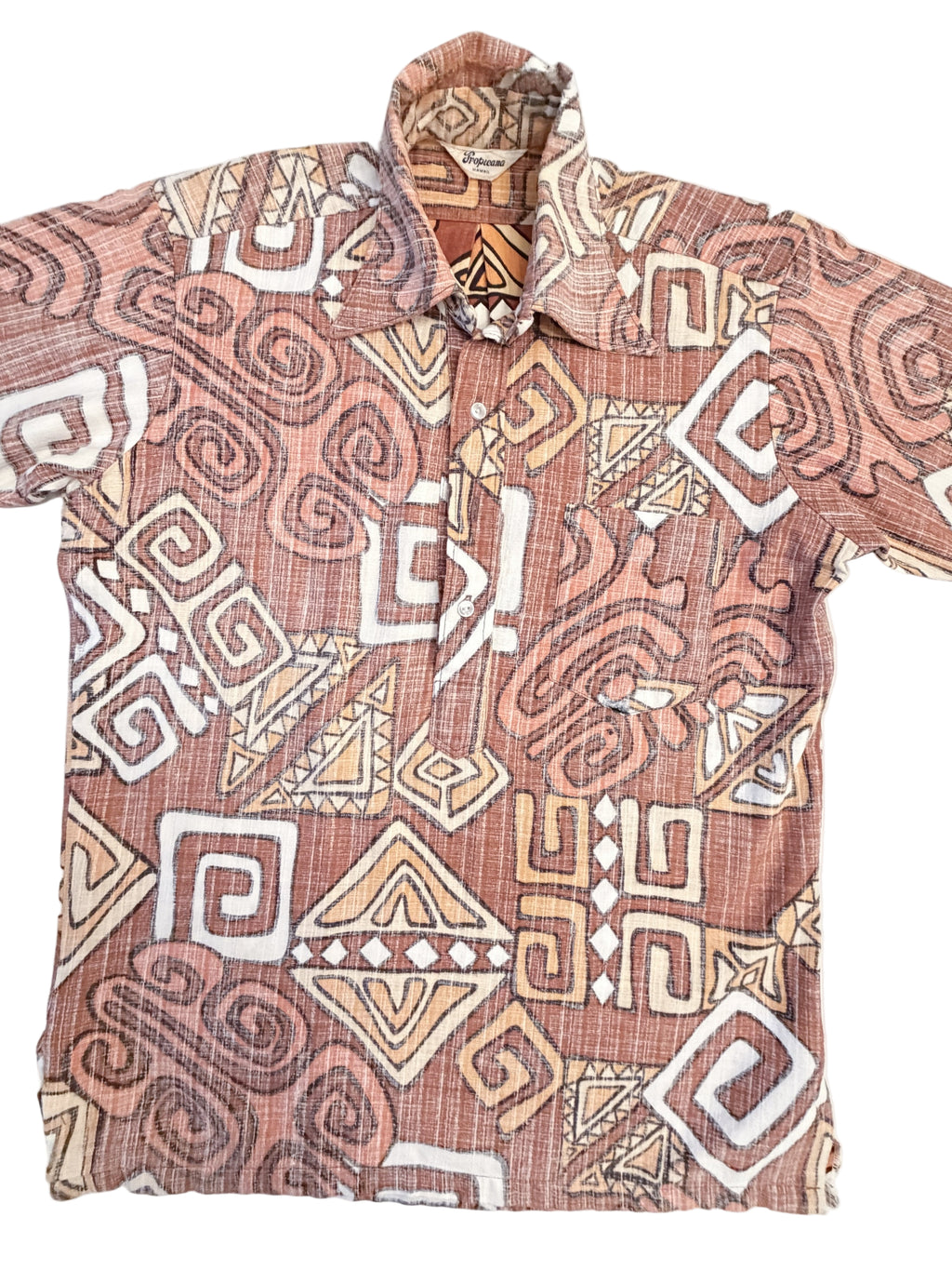 The shirt is constructed of bright Polynesian print fabric fabricated on the reverse side.