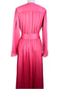 Long full sleeves, faux pearl buttons above the waist, attached belt.
